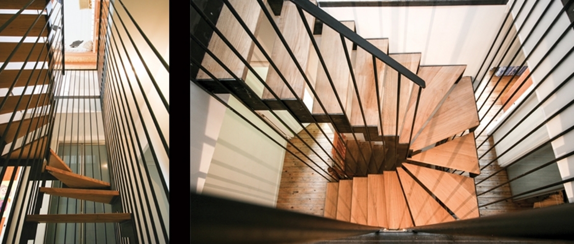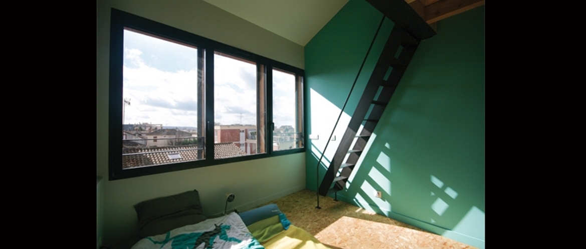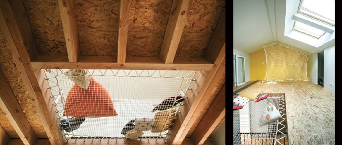 Une maison mitoyenne toute en hauteur, comme il en existe des centaines. Mais leurs propriétaires manquent de place avec la naissance d’Achille, le petit 3ème. La solution ? Surélever ! La maison se voit donc dotée d’un étage supplémentaire, dédié aux enfants : chacun sa chambre, chaque chambre sa mezzanine, et un espace commun pour tous. Un grand filet permet de faire une sieste, suspendu à plusieurs mètres audessus du sol. Ce grand vide permet également d’apporter la lumière au coeur de la maison, et à tous les étages à travers l’escalier. Les matériaux bruts et la structure restent apparents, comme les dalles de plancher, les solives en bois ou les poutres acier. Ils offrent des espaces sobres, lumineux et chaleureux. Ce projet en secteur sauvegardé, en ville, et en hauteur, a été qualifié par certains de « dantesque » ! Mais pour que chacun trouve sa place dans la maison, et que celle-ci s’adapte à la famille en évolution, rien n’est impossible...