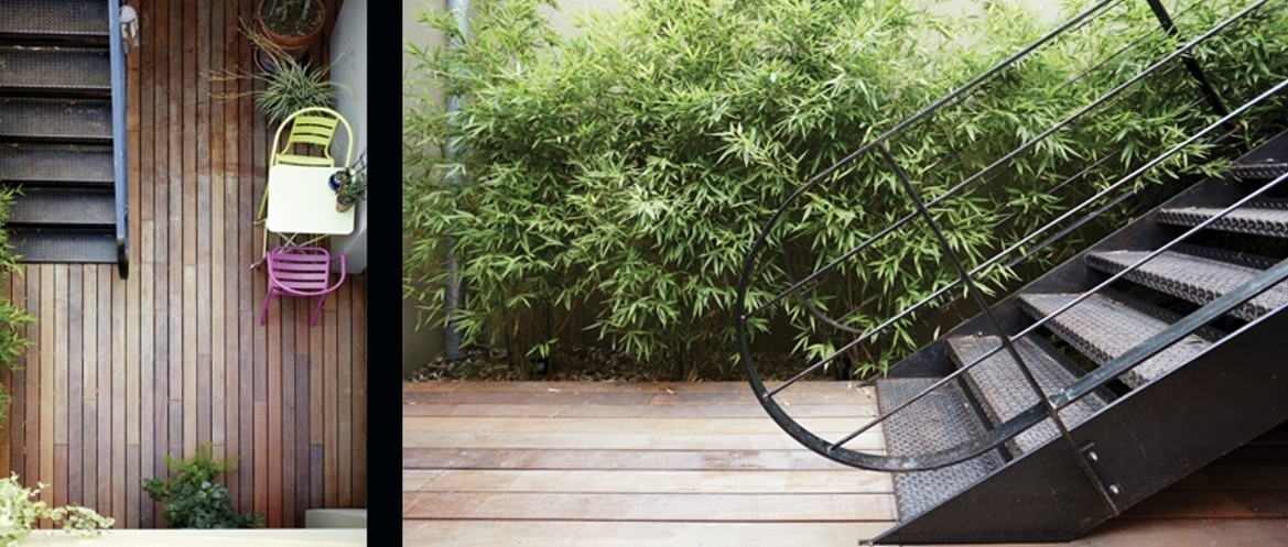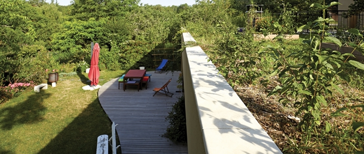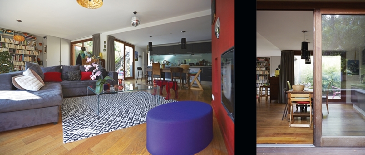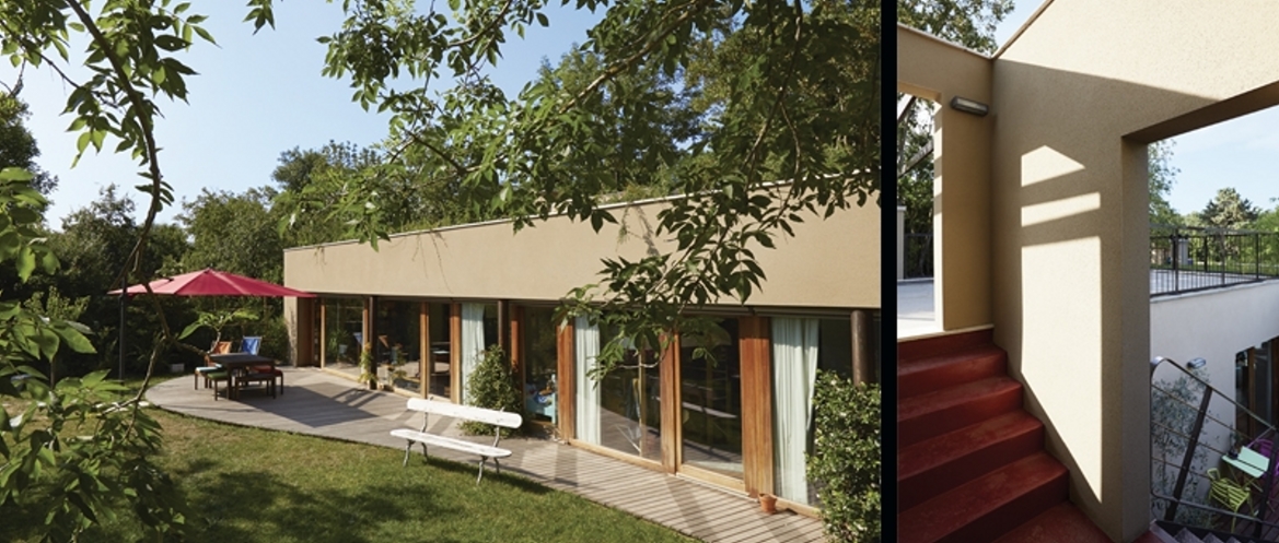 Le terrain était séparé de la rue par un talus abrupt pris dans une végétation dense. Difficile d’y descendre. Mais une fois le bosquet franchi, on découvrait une clairière ensoleillée en légère pente vers le sud avec une vue pittoresque sur le coeur du village. Quelle émotion ! Depuis la rue, il est difficile de distinguer la maison. Seuls deux volumes aux dimensions modestes bordant l’emplacement réservé aux voitures émergent des arbres. Après avoir franchi la grille, le regard est attiré vers le bas. L’accès à la maison se fait par le volume de droite. Un escalier extérieur en acier conduit le visiteur au patio situé en contrebas, transition entre l’extérieur et l’intérieur. « Un vestibule à ciel ouvert ». Ici, la maison se fait transparente. En tournant la tête à gauche on distingue à travers la cuisine un sous-bois habité : une table et deux bancs viennent chercher la fraîcheur des arbres. En face, le regard traverse le séjour pour plonger dans un jardin protégé. On retrouve alors la clairière bordée d’arbres, une terrasse en bois, un bassin, et au fond le village avec son clocher en briques.