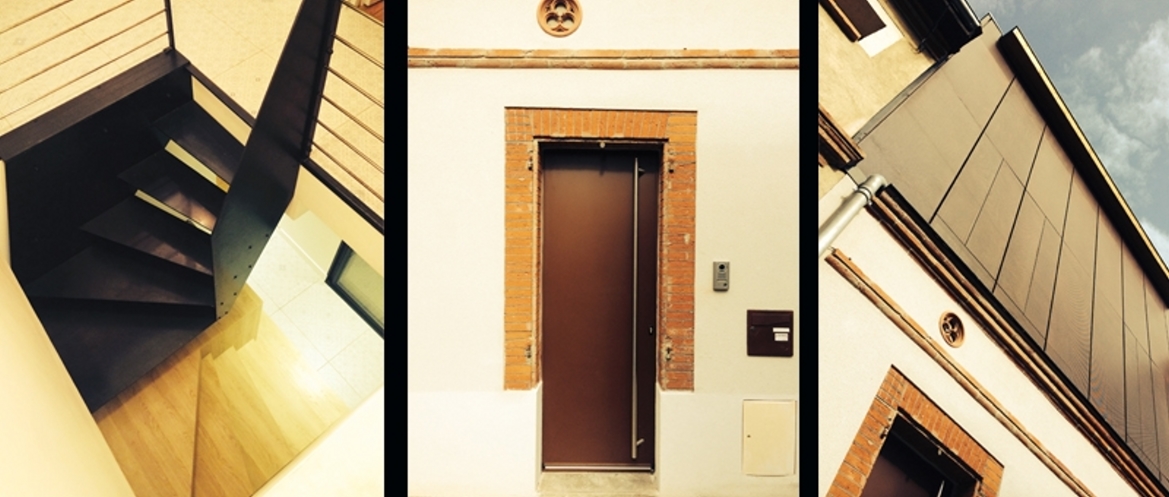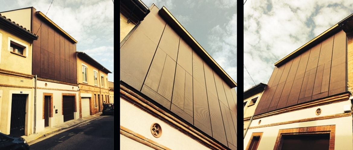 Cette extension située dans une ruelle étroite du quartier Empalot à Toulouse est le fruit d’une réflexion visant à inscrire le bâtiment dans sa modernité en proposant une écriture résolument contemporaine, sans ostentation, élégante, dans un contexte aussi sensible que cette frange urbaine en désertion soumis à la réglementation des bâtiments de France et à l’aplomb du tunnel du métro… La toulousaine est conservée dans sont aspect d’origine, les façades traitées dans le respect de l’ancien et mise en valeur par les menuiseries ton corten. Un volume en extension par dessus et un plus petit à l’arrière sur le jardin abritent les fonctions du programme. Telle une mantille, une fine résille d’acier corten perforé enveloppe intégralement le volume en extension sur la rue. Ouverts, les volets pliants en modulent aléatoirement la plasticité et laissent entrer pleinement le soleil à travers les grandes ouvertures situées en arrière de la peau. Fermés, ils permettent d’intimiser les pièces, tout en ménageant de larges vues sur l’extérieur. Les espaces intérieurs s’habillent de matériaux nobles et chaleureux ou le bois, l’acier et la céramique mêlent leurs tonalités contemporaines, et profitent de vues traversantes entre le jardin et un patio intérieur.