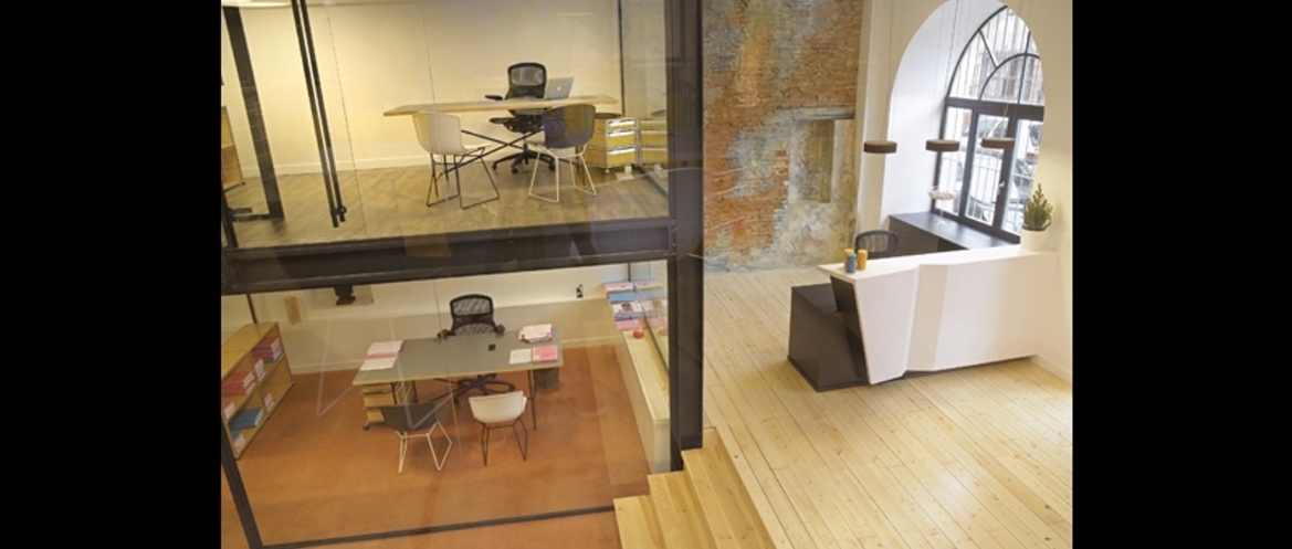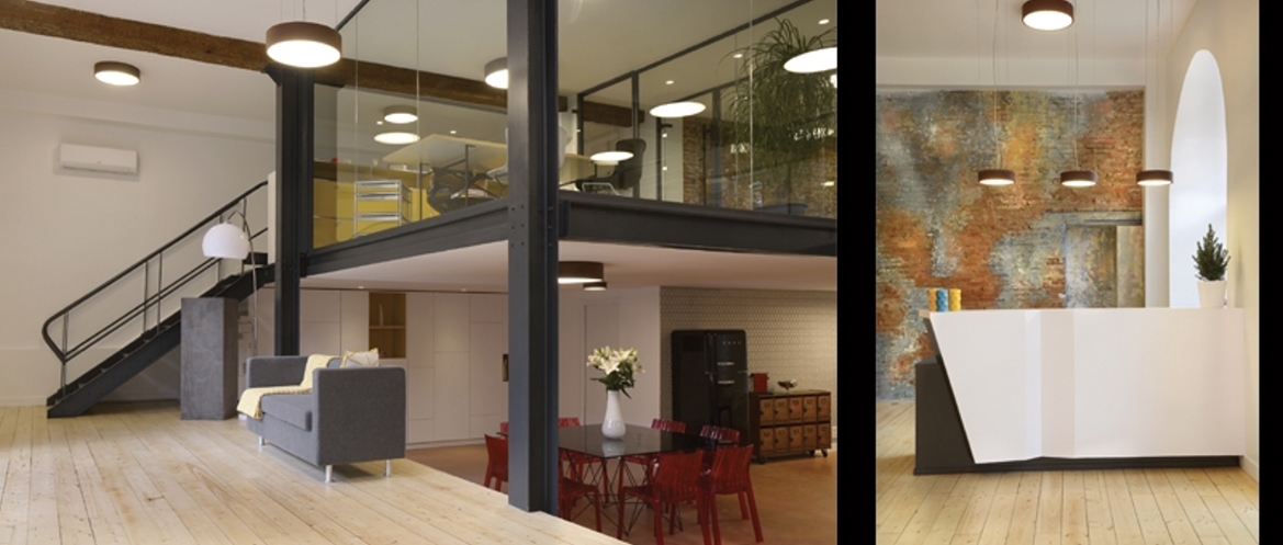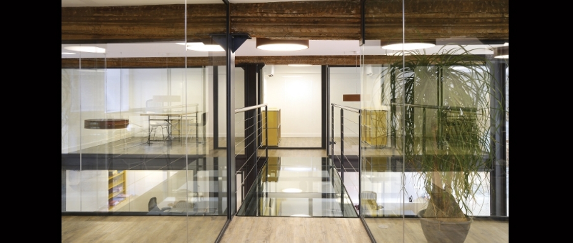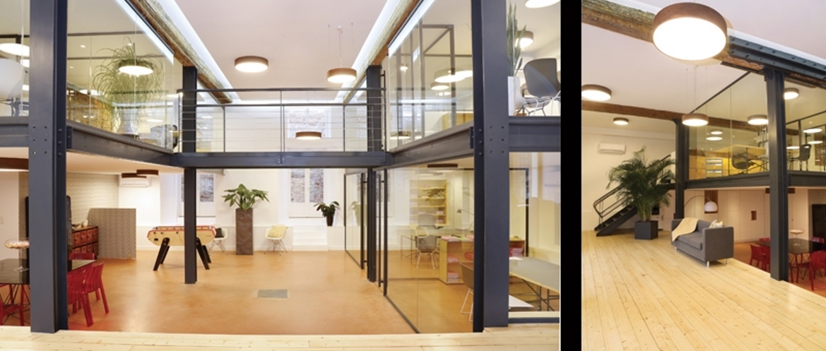 Pour cet ancien loft conçu en duplex, la contrainte principale du cabinet était d’amener de la lumière naturelle. L’important, pour l’architecte qui a géré le projet, consistait à aménager plusieurs zones de travail, en répondant aux besoins des collaborateurs actuels qui y travaillent mais surtout en anticipant les besoins de demain qui verrait des partenaires supplémentaires arriver. L’architecte a donc recloisonné l’espace : la travée centrale de l’étage a donc était coupée en deux pour communiquer avec la cour intérieure et une passerelle en verre a été mise en place pour relier les deux paliers. On notera la présence de corniches lumineuses qui viennent souligner cette séparation. Au rez-de-chaussée, un mur en briques a été enduit avec des pigments de couleur qui reprennent les coloris du mobilier et les luminaires. Enfin, pour répondre à cette délicate question de la luminosité, les bureaux ont été totalement vitrés. Ils créent ainsi « des boîtes en verre » et participent à cette lumière naturelle retrouvée.