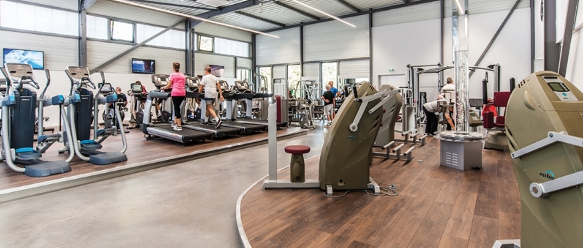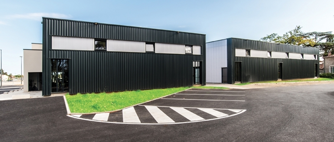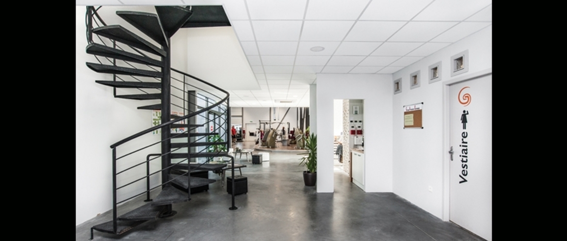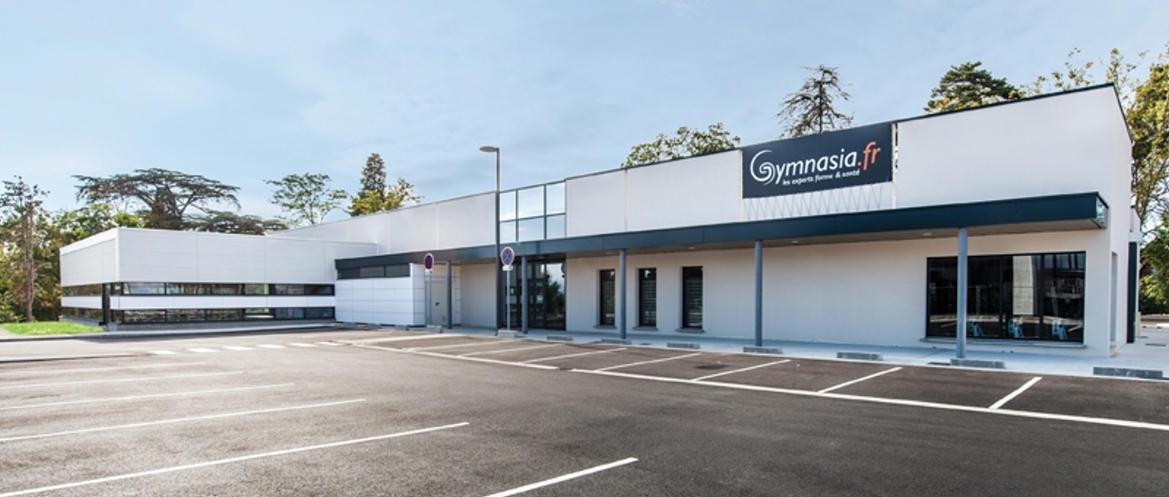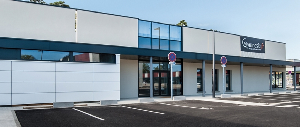 Ce complexe sportif s’inscrit dans une zone commerciale en devenir car en cours de finalisation. Notre bâtiment s’implante en fond de parcelle afin de bénéficier d’un maximum de place de parking nécessaire à l’exploitation des installations sportives. Ces espaces de stationnement « foisonnent » selon les activités en fonction des horaires d’utilisations. C’est avec une « complicité » certaine que le promoteur aménageur du « retail commercial » a favorisé la réalisation de ce bâtiment qui affiche sa différence architecturale tout en utilisant des teintes et des matériaux similaires à l’ensemble construit sur le site. La conception générale de Gymnasia s’articule sur une surface de plancher de 1 204 m2 de plain-pied et propose trois parties principales selon les différentes fonctions : • Un élément central et linéaire abritant les zones de services : vestiaires, sanitaires et locaux techniques • Un « hall » en acier formant un portique monopente abritant les salles de sport : fitness, danse et cardio • Un volume excentré et perceptible en façade sud principale qui protège la piscine, véritable écrin avec sa charpente en bois et ses « lanières de vitrage ». Le bâtiment affirme donc sa modernité et sa parfaite adéquation avec son usage sans pour cela utiliser un effet vitrine trop « appuyé » et souvent contraignant thermiquement.