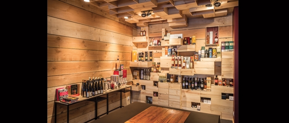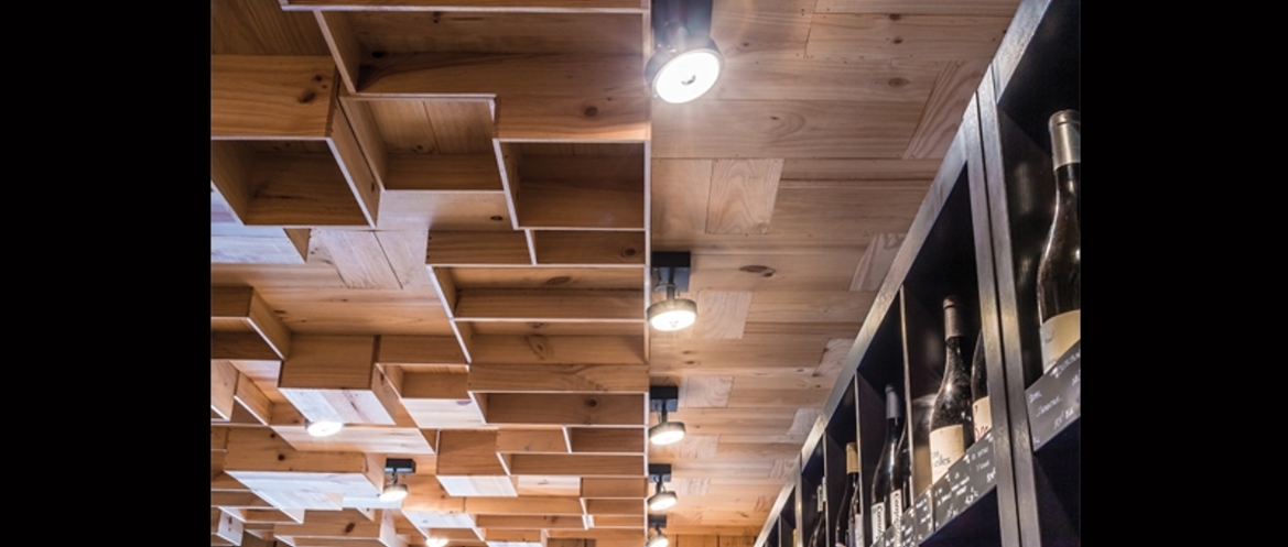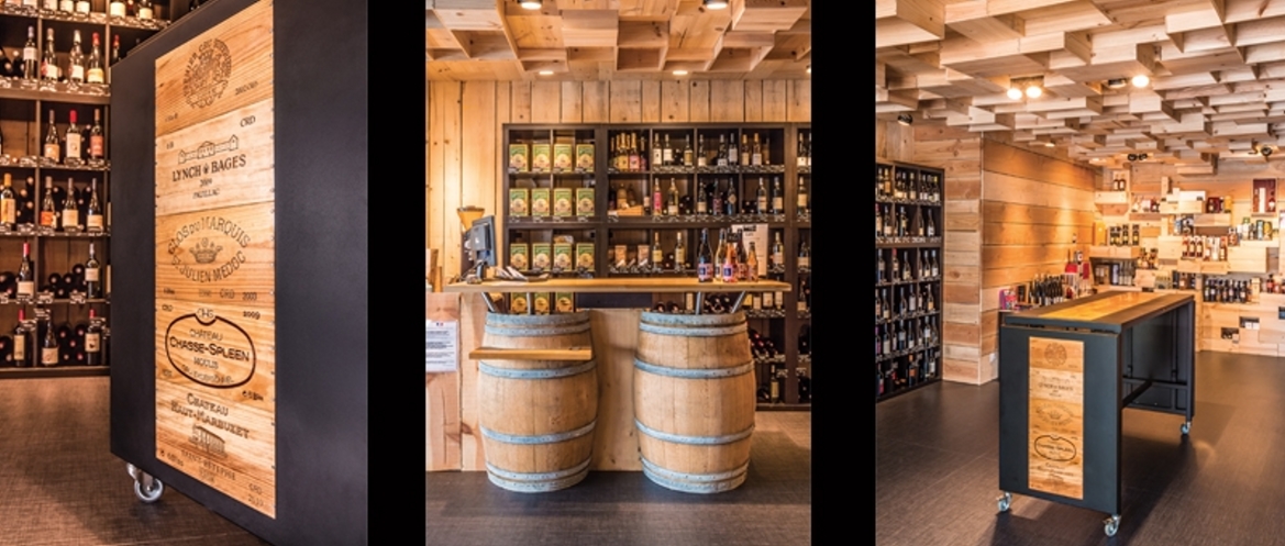 Un budget limité, des rayonnages de récupération, les murs, sol et plafond aseptisés d’une ancienne poissonnerie… voici les ingrédients avec lesquels CPL Architecture a dû composer pour cet aménagement. Comme point de départ de la réflexion, cette idée que le vin véhicule une image de convivialité, d’excellence et de noblesse, mais reste issu d’une pratique artisanale, pour ne pas dire paysanne. Le bois, matériau à la fois noble et modeste, et tous les attributs qui servent à la confection du vin (caisses, barriques, …) sont ici utilisés pour amener chaleur et intimité. Sous forme de voliges brutes, à peine rabotées, il habille les murs de façon très simple, à la manière dont peuvent être construits certains entrepôts. Le plafond, véritable point d’orgue de cet agencement, découle quant à lui d’un calepinage plus sophistiqué. Composé de trois types de caisses, il anime l’espace, surprend le visiteur et feutre l’ambiance. Il se retourne sur le mur du fond pour se faire écrin des plus beaux crus. L’espace est réduit, mais doit cependant pouvoir accueillir régulièrement les amateurs pour des séances de dégustation. Pour y satisfaire, une table modulable, pouvant accueillir de 6 à 16 convives vient compléter l’ensemble de l’aménagement. Tout de métal réalisé, un chemin de table composé avec de vieilles estampes assemblées rappelle qu’en ces lieux, le vin est au centre de tous les échanges !