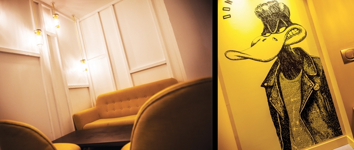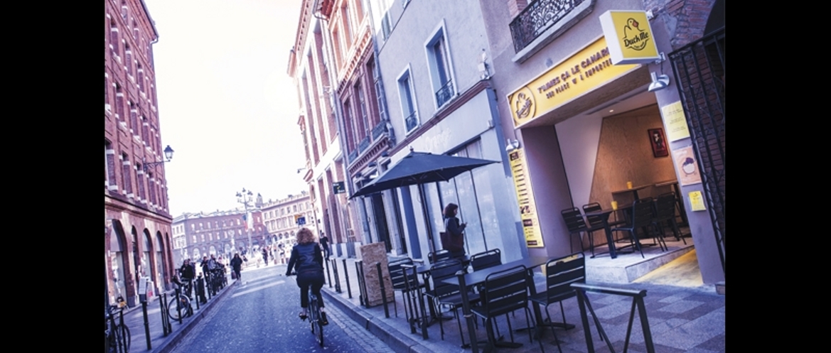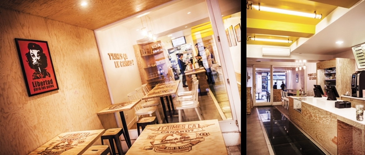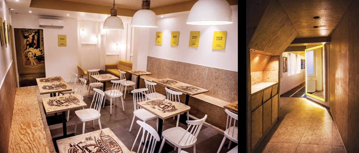 Situé dans l’hyper-centre de Toulouse, à deux pas du Capitole, ce fast-good spécialisé dans le canard défend une cuisine locale avec des produits de qualité. Troisième établissement de la chaîne, l’enjeu sur ce lieu était d’asseoir l’image de la marque avec une identité forte et reconnaissable. Depuis la rue, une terrasse couverte habillée d’un ruban de bois brut et d’une rampe jaune attire le passant et l’invite à entrer. A l’intérieur, une atmosphère chaleureuse typiquement « Duck me » : des matériaux bruts et de caractère tels l’OSB et le pin associés à des matériaux plus nobles tels le corian et la céramique. La succession des espaces, rythmée par un jeu de matériaux, de patines et de lumières donne un dynamisme au cheminement, propice à la découverte. L’identité graphique de Duck Me s’affiche avec humour et douce provocation sur les murs, les luminaires et le mobilier.