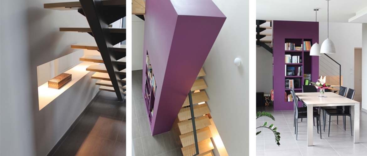 A l’intérieur, l’escalier s’enroule autour d’un meuble bibliothèque, dans un espace d’accueil et de distribution à double hauteur. Plusieurs fentes, niches, interstices rythment les jonctions entre les espaces, favorisant à la fois les perspectives et les espaces intimes ainsi que les jeux d’ombre et de lumière.