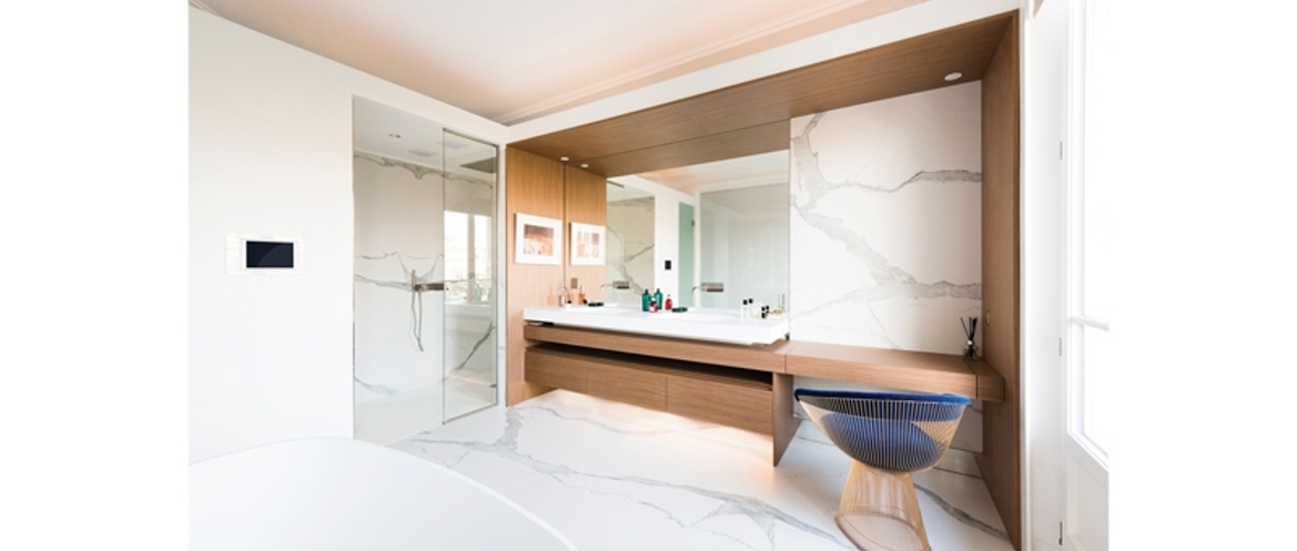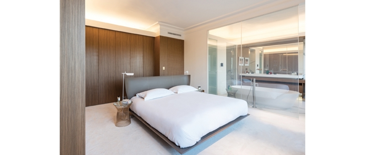 Pour la rénovation de cet appartement l’Atelier M a déposé, découpé et retravaillé la majeure partie des espaces tout en gardant l’âme du lieu. Il a fallu faire table rase de l’ancienne version pour accueillir les technicités actuelles comme la climatisation et la domotique. Exit la cloison séparative du salon vieillot pour redonner du volume et offrir un espace lumineux et épuré en gardant les témoignages de l’ancienne version. Si la distribution est quasiment similaire au plan initial, certaines pièces ont subi un relooking important. C’est le cas de la chambre, modernisée et semi-ouverte sur la salle de bain, imaginée comme une suite d’hôtel, qui s’affi rme désormais comme un endroit incontournable de l’appartement. Nous voulions obtenir des vues traversantes et un croisement de fl ux lumineux. Pour donner cet effet, des panneaux en verre actif alternant opacité et transparence relient mais aussi séparent subtilement la salle de bains. L’idée était de travailler sur différentes vues tout en préservant l’intimité de chaque endroit. Au fi nal, le nouveau visage de l’appartement allie discrétion et style, luxueux et surtout pas ostentatoire.