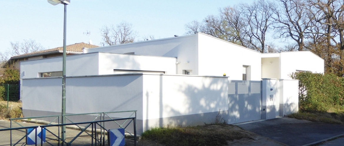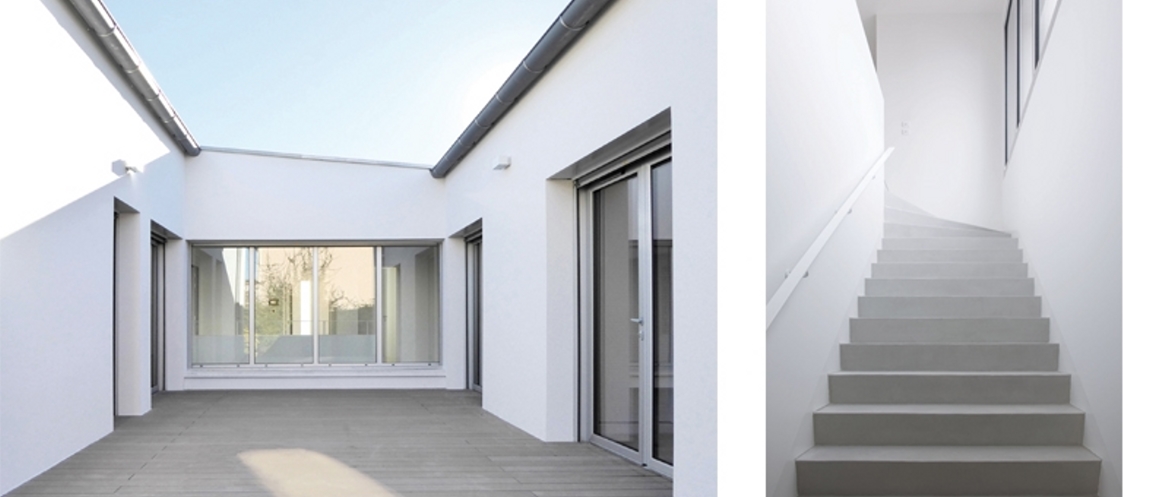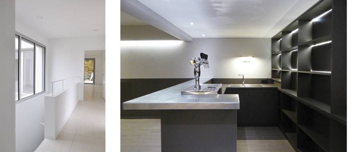 Situé dans un lotissement des années 90 constitué de maisons et de petits collectifs, le terrain a la particularité d’être bordé de haies et d’avoir une pente qui l’oriente naturellement sur un bois. La maison est implantée en rez-dechaussée et rez-de-jardin au plus proche de cette végétation existante. Deux corps de bâtiment, séparés par un patio central, accueillent à l’ouest l’aile des enfants et, à l’est, les espaces de vie et la chambre parentale. En rez-de-jardin, deux pièces de réception sont aménagées. La première pièce s’ouvre largement sur la piscine tandis que la seconde, dépourvue d’ouverture est plus intimiste. Face au bois, de vastes terrasses offrent depuis les pièces de vies des cadrages vers les grands chênes du bois. Le traitement des façades et les matériaux donnent une lecture claire du programme : deux maisons, revêtues d’enduit blanc et unies par une toiture asymétrique, reposent sur un socle en béton gris. L’intérieur de la maison reprend ces nuances, le rez-de-chaussée à dominante blanche contraste avec les teintes grises du rez-de-jardin. La maison est équipée de systèmes domotiques et de géothermie qui lui assurent une très faible consommation d’énergie.