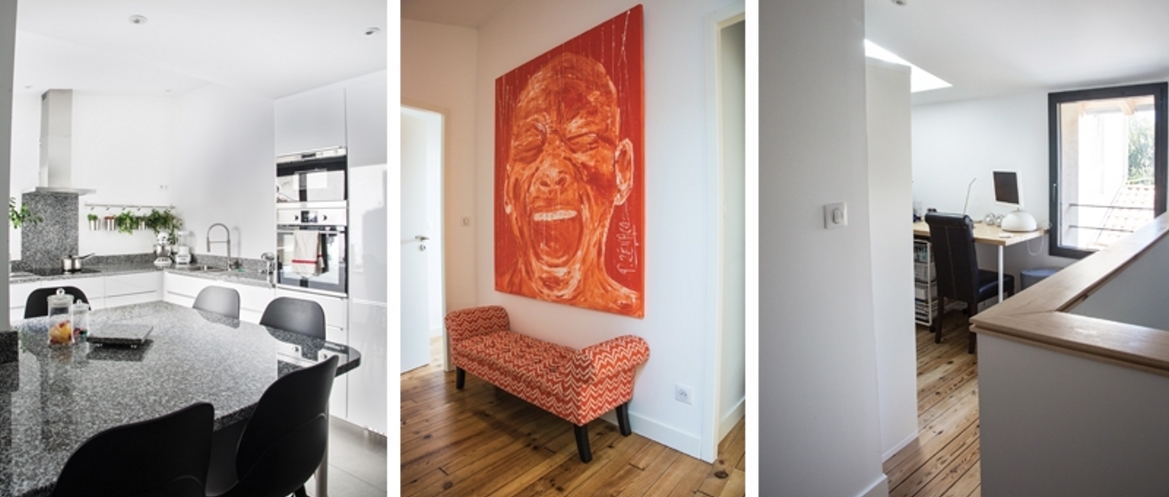 Le projet porte sur la restructuration d’une maison de ville, du début XXème. La maison originelle était composée de petits espaces sombres, sur 2 niveaux totalisant 126 m2. Les axes principaux du projet sont : - l’organisation d’espaces fl uides et décloisonnés, - réussir à supprimer ce sentiment « d’écrasement » du fait du plafond bas. - « inonder » de lumière naturelle les pièces, - ouvrir le séjour et la cuisine sur la cour, qui devient la 5ème pièce, - être généreux en rangements. Livrée en juin 2017, cette charmante maison de ville a retrouvé un second souffl e et devient alors un lieu de vie agréable, lumineux et accueillant. Depuis 10 ans, l’Atelier MRA intervient beaucoup sur des projets de restructuration et de rénovation. Une analyse des besoins, une écoute attentive, une véritable synergie créée avec les clients et la collaboration avec des entreprises qualifi ées apportent une réelle plus value à la réalisation.