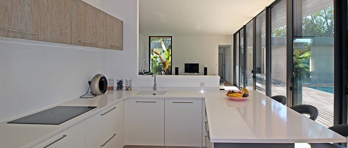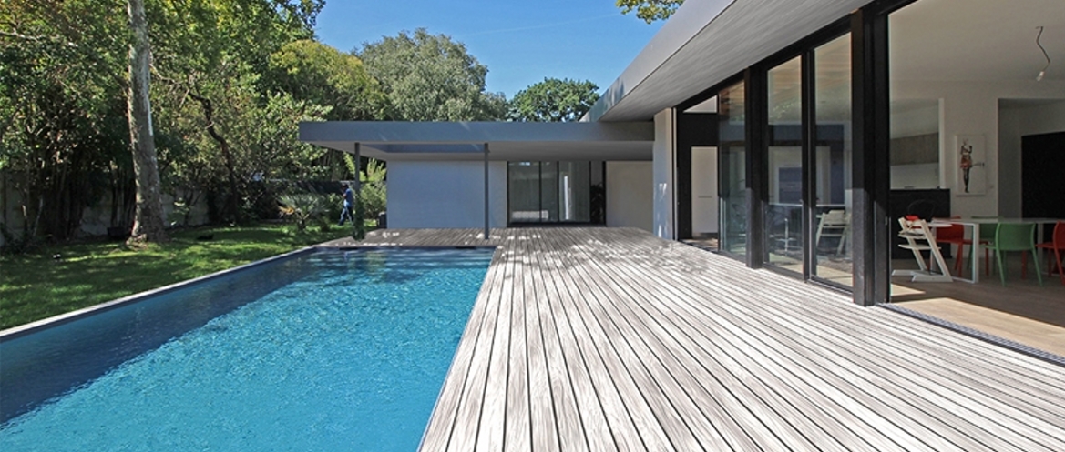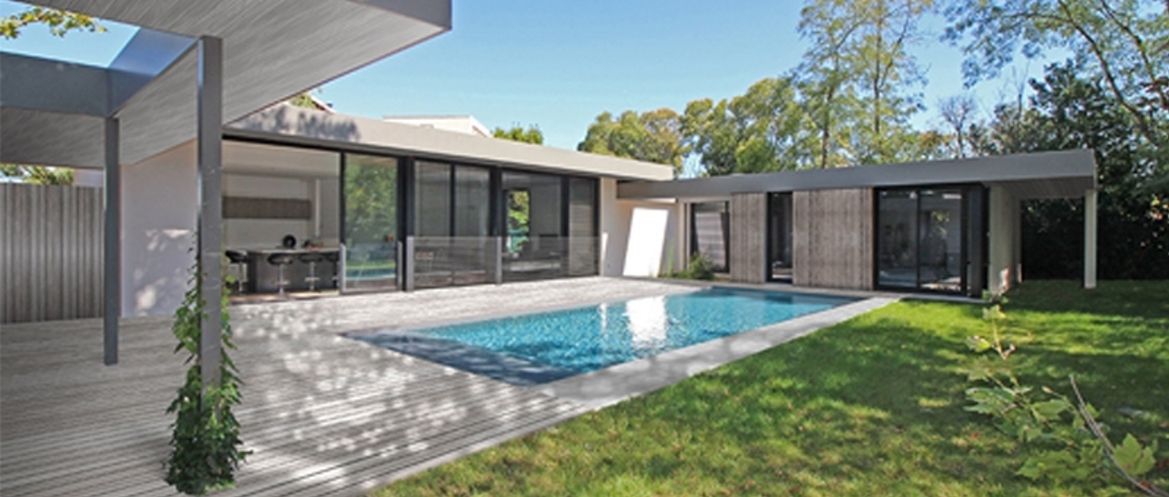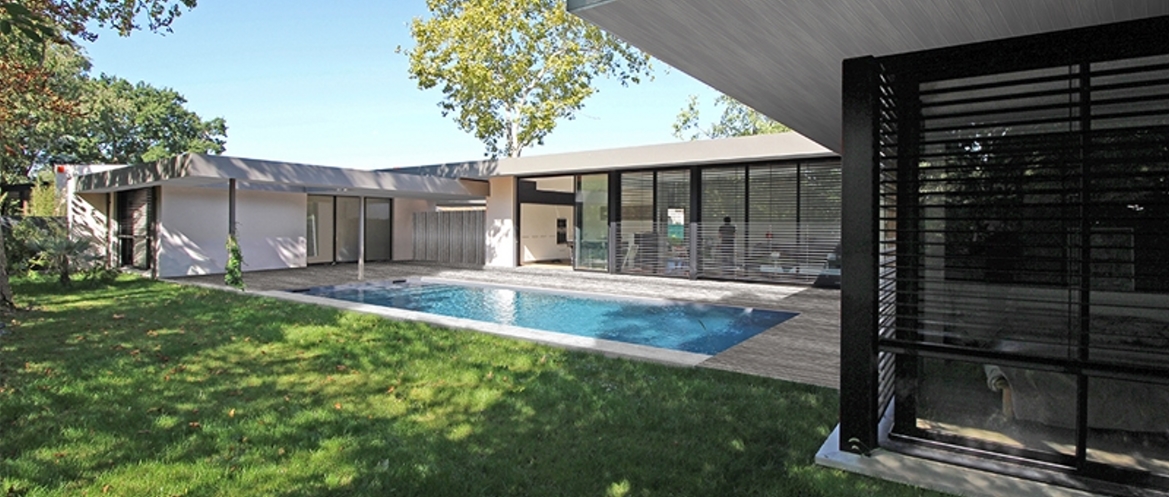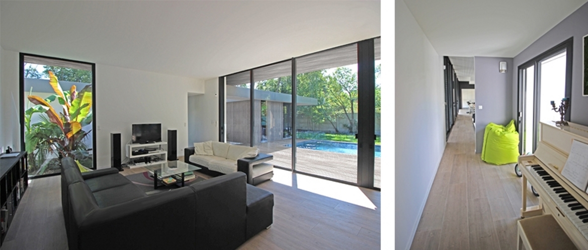 Située en milieu urbain, la maison à patios crée un cocon intime pour ses habitants en la protégeant à la fois de la rue par une façade fermée, et par son implantation en C qui bloque la vue depuis les parcelles voisines. Les façades sud, est et ouest peuvent ainsi être complètement ouvertes par des baies vitrées toute hauteur, s’ouvrant largement sur une terrasse bois et une piscine. Pour maximiser l’effet dedans/dehors, tous les seuils sont encastrés. Une très importante terrasse couverte permet de vivre dehors à tout moment de l’année. Cette ancienne parcelle maraîchère était très boisée. Pour ne pas dénaturer le site, la maison s’est implantée entre les arbres. Pour cette raison, la toiture haute et la toiture basse s’ouvrent à l’entrée pour laisser passer le grand platane, et deux petits patios viennent s’encastrer entre les ailes laissant la végétation s’introduire dans la maison. Pour permettre une grande liberté, la structure est en ossature bois. Les matériaux d’isolation ont été sélectionnés pour leurs qualités naturelles (chanvre, fi bre de bois).
