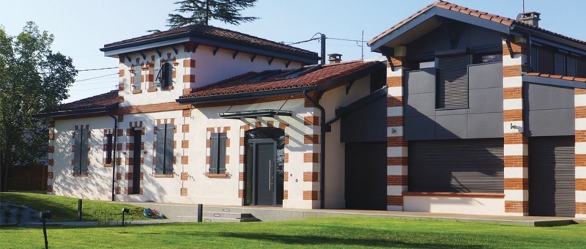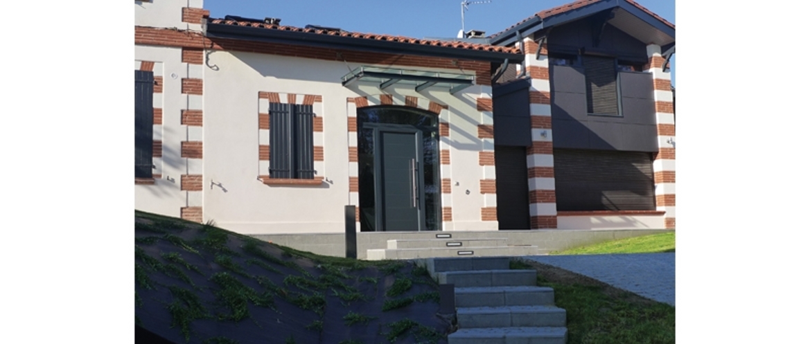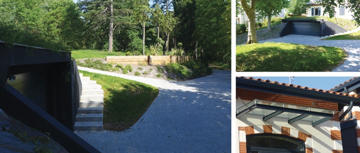 La construction fi n XIXème siècle est située dans un parc à proximité de Toulouse. Le projet comprend 3 volets principaux : Rénovation des façades Les enduits et les éléments de modénature, les appareillages de brique et de pierre ont été reconstitués ou redessinés, les parties pleines ont été revêtues de panneaux de bardage en fi bre minérale teintés dans la masse. Construction d’un garage enterré La construction est implantée à l’entrée de la propriété et enterrée afi n de limiter son impact paysager. Sa présence n’est pas perceptible depuis l’habitation. Les plantations d’espèces rampantes devraient à terme faire disparaître un peu plus l’édifi ce derrière un rideau végétal. Aménagement paysager Dans le prolongement de la construction du garage, les cheminements piétons et véhicules ont été entièrement recomposés et traités principalement en pavage de granit. Le parvis de l’habitation et les emmarchements sont aménagés avec des murets de pierres grises fl ammées avec des plages en lames de bois. Les plantations d’arbres, de haies, de fl eurs et la qualité de l’éclairage mettent en valeur le bâtiment et son environnement.