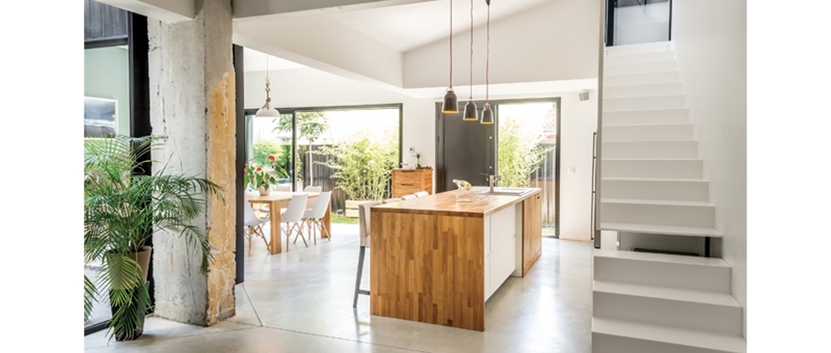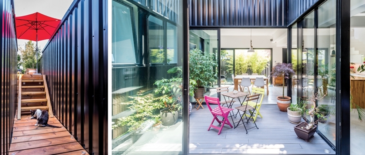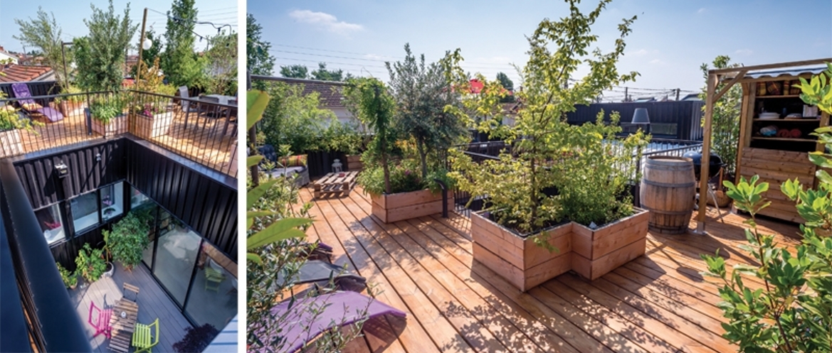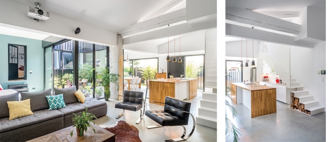 Pour redonner vie à ce lieu, nous avons créé un patio, véritable pièce à vivre et pivot du projet, toutes les pièces s’articulent autour… En référence au passé industriel du lieu dont nous avons conservé quelques éléments caractéristiques tels que les quais, nous avons utilisé du bardage acier en façade et du béton au sol. Au niveau des toitures, nous avons ajouté une surélévation et remplacé les pentes par un rooftop, véritable jardin dominant les toits du quartier. Projet diffusé à la Maison France 5.