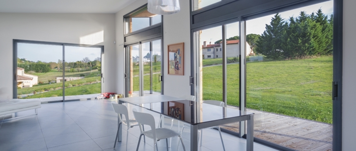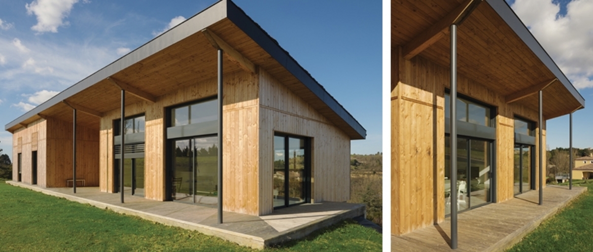 Le volume étroit et allongé présente une façade Sud largement vitrée avec une toiture monopente conçue avec de larges débords protégeant du soleil d’été les baies vitrées de la partie jour et ménageant une terrasse abritée du vent d’Autan.