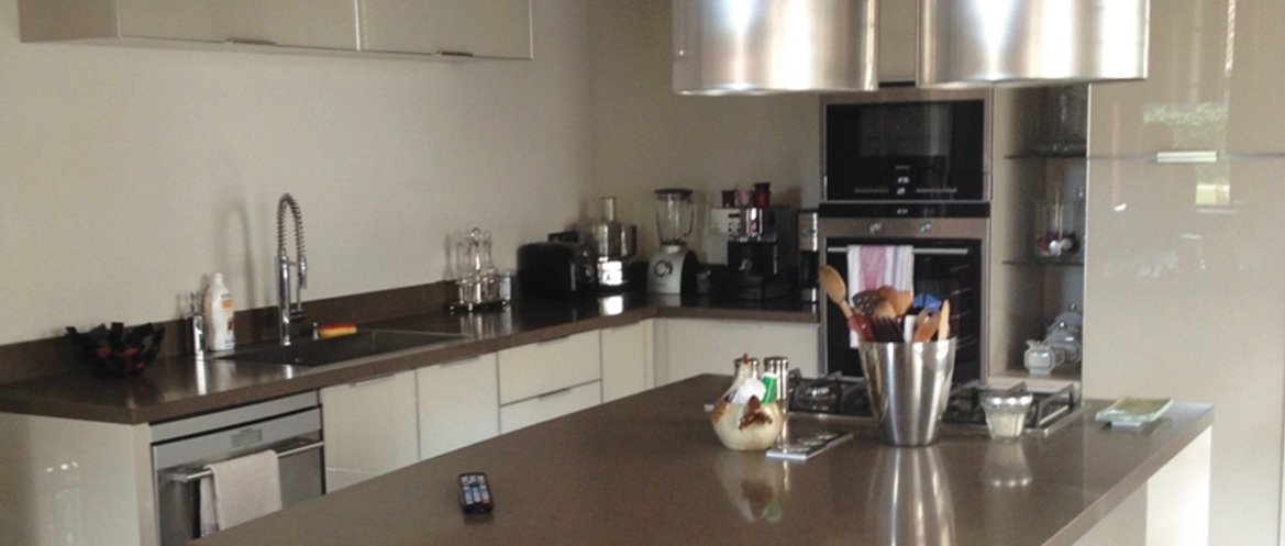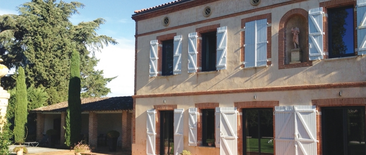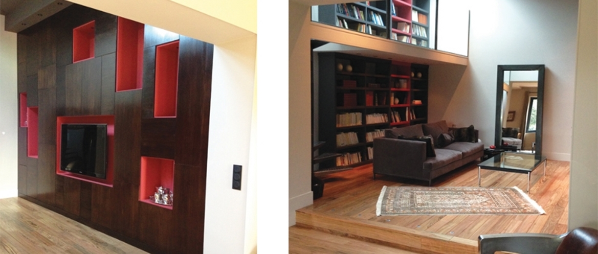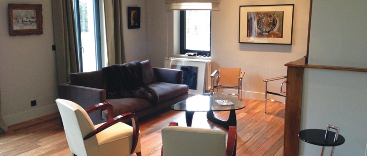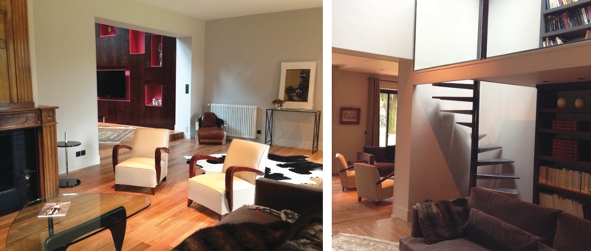 Le parti pris de cette réalisation, était de moderniser cette vieille demeure, tout en gardant les éléments anciens, comme par exemple le tablier de la cheminée 18ème, avec son trumeau. J’ai crée un grand salon de réception, et dans l’ancien atelier un salon télé bibliothèque plus intime. La pièce s’y prêtait par la configuration en L, avec une hauteur sous plafond de 4m30, ce qui m’a permis de jouer sur les volumes, et surtout d’intégrer dans les plafonds l’ensemble des spots et les enceintes. Une bibliothèque a été installée sous et sur la mezzanine, et peinte sur les deux niveaux, en y intégrant une couleur différente sur une partie des étagères, pour obtenir une verticalité tout en ayant une continuité visuelle du sol au plafond. Un garde-corps en verre a été posé, ainsi qu’un escalier en colimaçon très brut en métal, façon usine. Pour rompre avec cet élément très contemporain, le mur opposé fût habillé de placards qui ont été recouverts de palissandre, ainsi que de niches, peintes en rouge pour donner de la profondeur. J’ai choisi pour le sol, un parquet massif en mutenyé, avec leds intégrés au niveau de la marche, et un changement de sens des lames de parquet. Pour l’ensemble, j’ai utilisé des peintures Farrow and Ball : du gris pour les murs, du chocolat pour le plafond du petit salon, du tête de nègre et du rouge pour la bibliothèque. Pour les rideaux j’ai choisi un lin gris taupé de chez D.Kieffer, pour le mobilier, des sièges art déco, une paire de fauteuils Le Corbusier et des canapés Verzzeloni en velours taupe.
