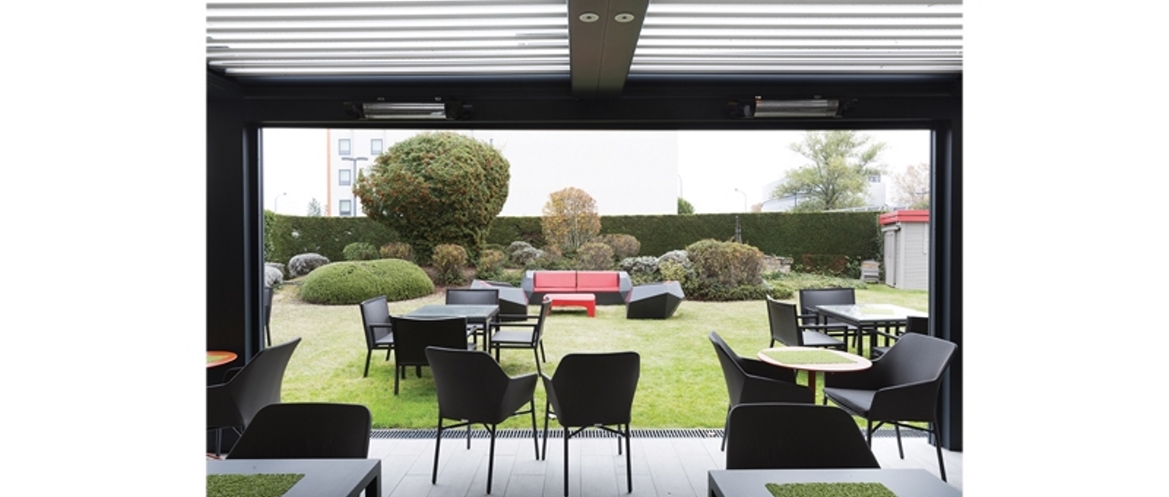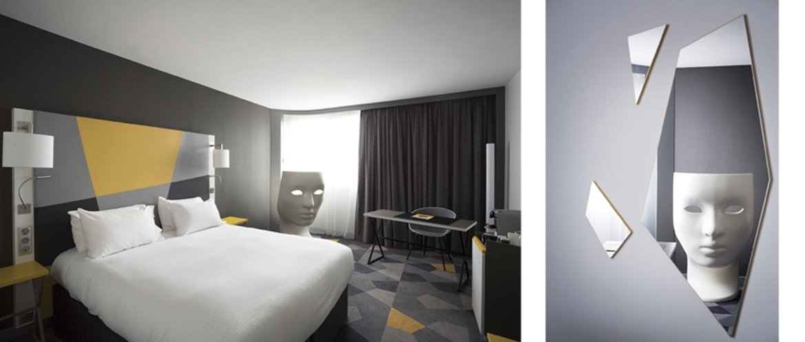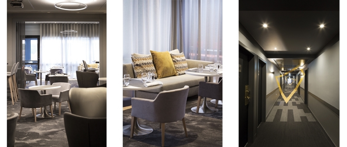 Idéalement placé au coeur de l’activité tertiaire de l’aéroport Toulouse Blagnac dont il fut le premier établissement, cet hôtel restaurant fortement fréquenté se devait de retrouver une image « casual chic » propre à la marque. Les services généraux sont retravaillés de façon à pouvoir accueillir en un seul lieu des espaces de réunions informelles, des moments de détente ou de plaisir. L’espace est ainsi décloisonné, le restaurant se prolonge vers le jardin sur une terrasse abritée d’une pergola bioclimatique qui permet de profi ter en toutes saisons de ce havre de verdure. Les chambres et les circulations sont profondément rénovées. La décoration des couloirs joue avec la perception de l’usager en dessinant de grandes anamorphoses qui en emprunte toute la perspective. L’atmosphère des chambres et des salles de bain est propice au repos, loin des clichés empruntés au monde de l’aviation, c’est un travail géométrique et chromatique qui anime l’espace et met en valeur de façon théâtrale de belles pièces iconiques du design contemporain.