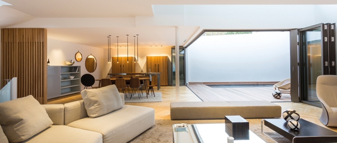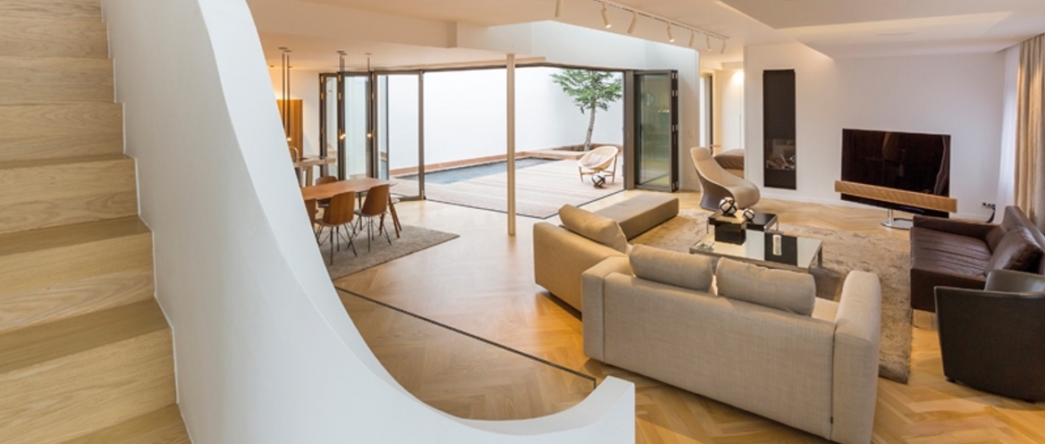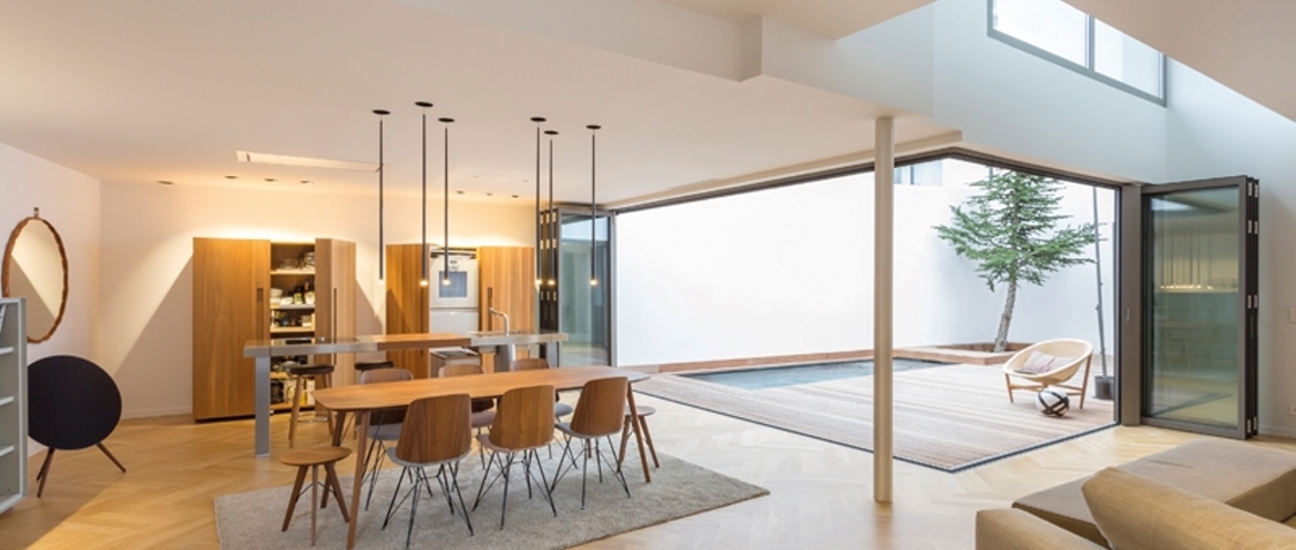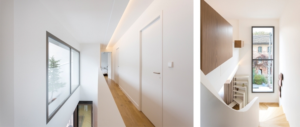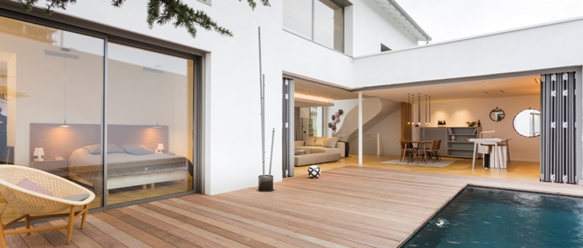 Cet ancien bâtiment industriel, tour à tour usine à jeans puis salle de danse, situé dans le centre-ville toulousain a été réhabilité intégralement. Ce projet avait pour objectif de recréer un espace extérieur et de surélever le bâtiment afin d’utiliser le rez-de-chaussée en garage. L’artère principale de ce projet est l’escalier d’inspiration art déco, qui comme une épine dorsale, conduit de l’entrée vers les niveaux supérieurs. Le premier niveau ouvre sur un espace extérieur composé d’une terrasse, d’une piscine et d’une jardinière de grande dimension qui accueille un arbre de haute tige. Une ouverture en angle de 14 mètres au système de baie accordéon a été pensée. Ainsi l’extérieur est un prolongement des espaces de vie intérieure, ce qui donne une sensation de volume confortable.