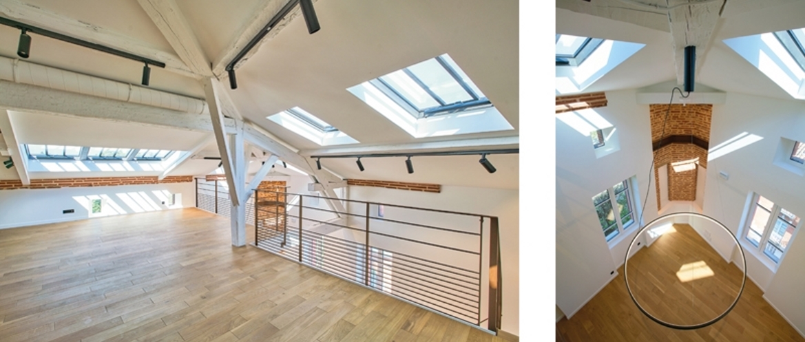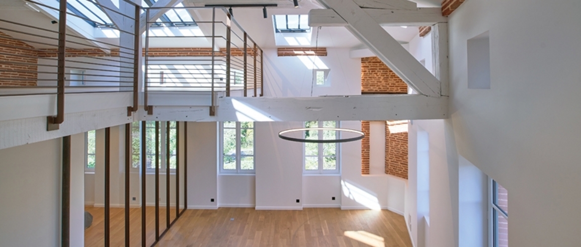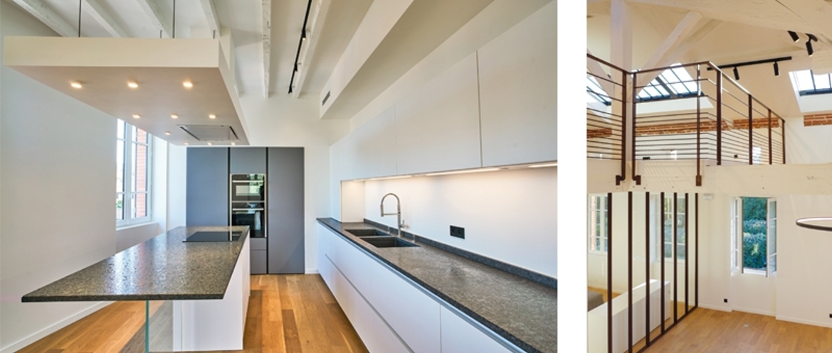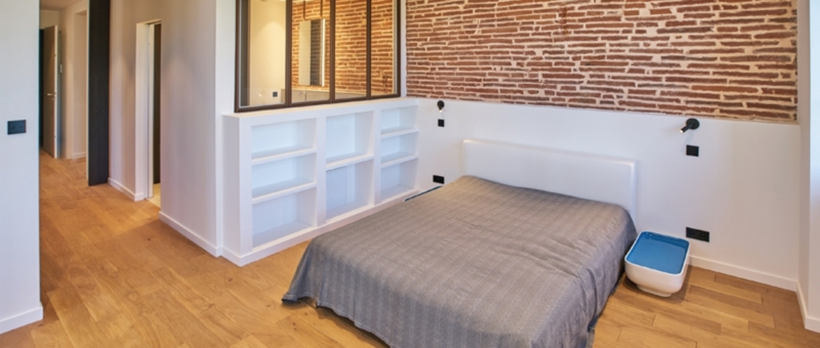 Les plateaux des 3ème et 4ème étages sous combles d’un immeuble toulousain situé en face du Jardin des Plantes ont été réunis à l’occasion du projet d’aménagement d’un duplex. Le plancher du 4ème étage a été partiellement évidé, pour permettre la création de volume de grande hauteur dans les pièces de séjour. L’éclairage naturel existant a été complété par des verrières de toiture. Le parti architectural est principalement axé sur la transparence entre les différents volumes, y compris dans les chambres et salle de bains dotées de cloisons vitrées. Depuis chaque pièce de l’appartement des 2 niveaux, des connexions visuelles sont créées en favorisant les perspectives vers le jardin des Plantes. Seules des pièces de service sont dissimulées du regard par des portes dérobées.
