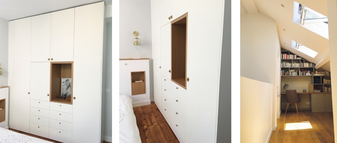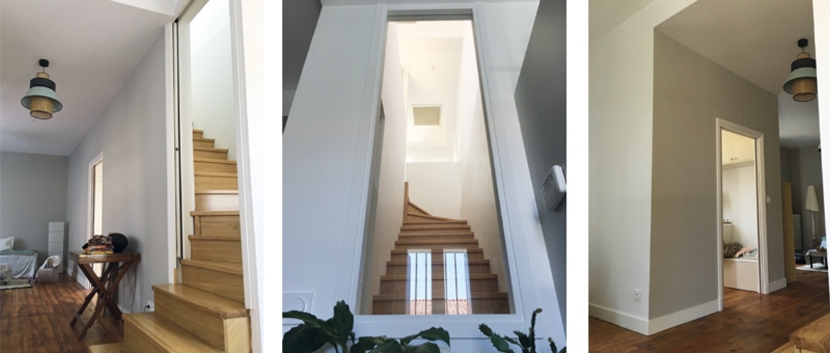À l’origine une Toulousaine traditionnelle au rez-de-chaussée très cloisonné, disposant d’un sous-sol desservi par une échelle de meunier et des combles accessibles par un escalier en colimaçon mangeant la moitié du salon. Finalement, une réfection des circulations intérieures par la superposition d’escaliers confortables, des reprises de structure et un réaménagement total des espaces de vie pour donner de l’espace, du confort, laisser circuler la lumière, créer des meubles intégrés, efficaces et esthétiques. Entre rénovation lourde et réaménagement fin, comme l’imposait le programme des clients, la maison a gardé son charme et mis en valeur les éléments qui la caractérisaient : parquet, portes moulurées, radiateurs en fonte, hauteur sous plafond… elle a gagné des espaces plus proches de leur mode de vie avec une organisation contemporaine de la villa associée à de larges espaces lumineux. En lien étroit avec les clients sur l’ensemble du projet, les choix de matériaux et de couleurs ont été valorisés par la propriétaire et son oeil affûté.