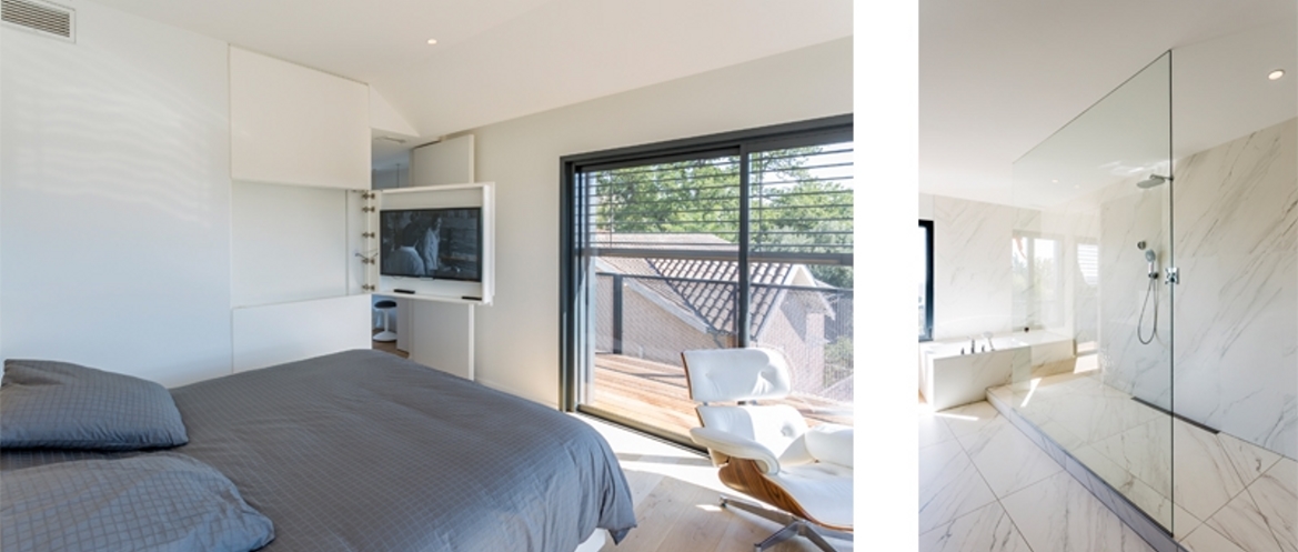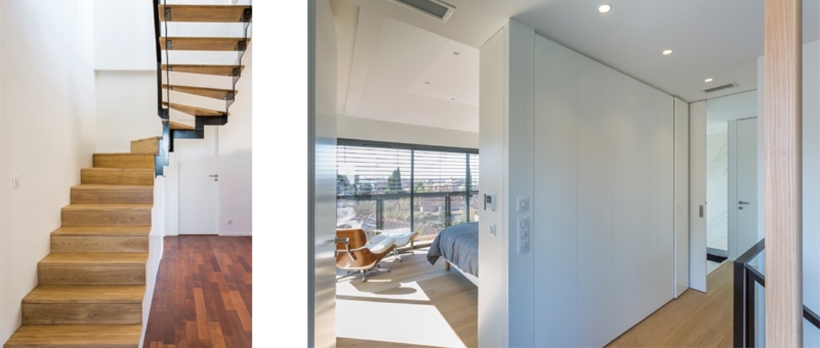 Une maison en R+1 dans un secteur proche du centre-ville de Toulouse et une envie des clients de pousser les murs pour créer une suite parentale. La parcelle étroite ne permet pas de s’étendre, mais de surélever. Ce nouvel étage est entièrement réservé aux parents, à travers un univers qui leur est personnel : chambre, salle de bains, dressing, bureau et balcons terrasses. Tous les espaces communiquent entre eux par un système de portes coulissantes invisibles et battantes sans cadres apparents, ce qui rend l’étage très fluide. Une ambiance zen et lumineuse, tournée aussi vers l’extérieur à travers de grandes ouvertures, dont la lumière est filtrée par des brises-soleil orientables. L’étage existant du dessous profite également d’un embellissement à travers un décloisonnement qui accueille notamment l’escalier et une grande pièce de vie ouverte pour les enfants.