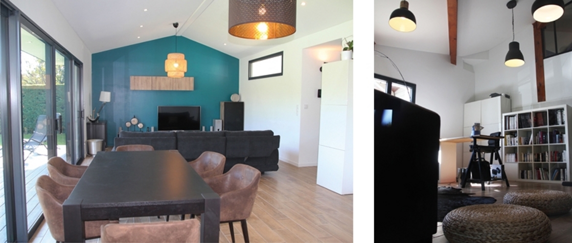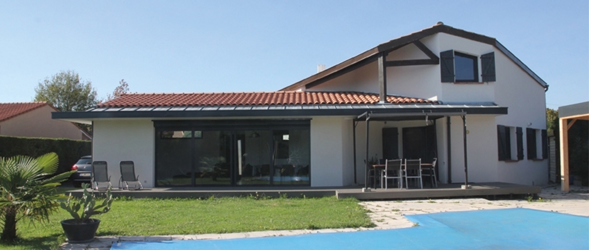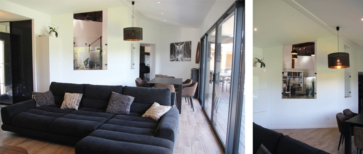 Cette maison des années 80 était organisée autour de multiples demi niveaux et d’une architecture à 45°. Notre projet a consisté à créer une extension comportant une entrée et un séjour orienté sur le jardin et la piscine. Sa forme rectiligne venant en contrepoint de l’architecture existante pour donner une image plus sereine à l’ensemble. Le séjour ainsi créé bénéficie d’un beau volume rampant sous toiture, il accueille le salon TV et la salle à manger. Une grande baie à galandage ouvre sur le jardin et la terrasse abritée par de larges avant toits. Les anciennes fenêtres traitées en ouvertures permettent de créer des transparences sur l’existant. La vue est transversale depuis le rez-de-chaussée jusqu’au 3éme niveau. Le traitement intérieur contemporain contribue à la modernité de l’ensemble.