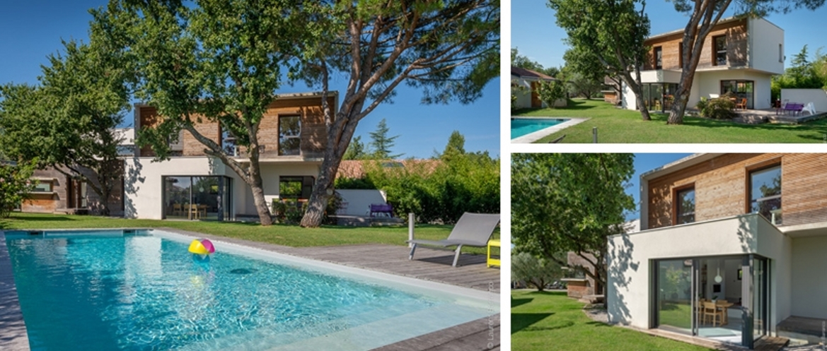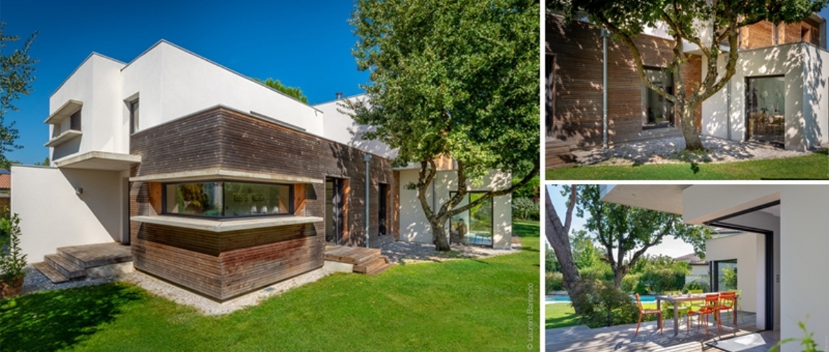 Afin de conserver de magnifiques arbres, le projet s’articule autour d’un axe orienté Est/Ouest, matérialisé par un volume en double hauteur. Les volumes abritant les pièces à vivre viennent s’y imbriquer. La modularité des espaces était également recherchée : deux grandes portes coulissantes relient les espaces de séjour, de cuisine et de salle télé. Une grande baie à galandage d’angle permet à la cuisine de s’ouvrir largement sur une terrasse bois. A la différence, le séjour s’organise de façon intimiste autour d’une cheminée. La salle à manger s’invite au même niveau que le jardin. Des ouvertures en vis-à-vis créent la transparence et une vue cadrée au plus prés d’un chêne permet de donner l’impression de déjeuner dans un écrin de verdure. Avec sa face habillée de bardage bois et cernée de casquettes béton, le volume de l’espace nuit enfant vient se poser en porte à faux sur cet ensemble. Une passerelle légère aux gardes-corps vitrés, traverse le volume en double hauteur et relie l’espace nuit enfants à celui des parents. Sur ce projet l’architecture bioclimatique fait corps avec la végétation qui participe au confort naturel des habitants.
