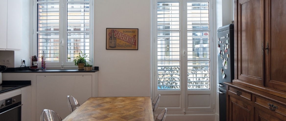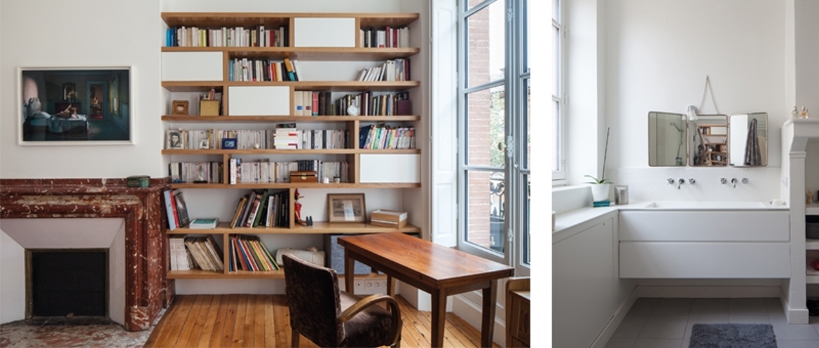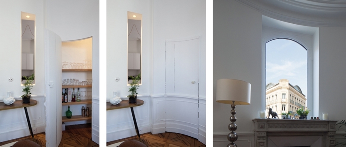 Rénovation d’un appartement de type haussmannien en centre-ville. Problématique : avec ses moulures, cheminées anciennes et parquets massifs ornant de généreux volumes, l’appartement disposait du cachet typique des immeubles haussmanniens. Sombre et fatigué, il convenait toutefois de lui offrir une nouvelle jeunesse et d’améliorer dans le même temps son confort thermique et acoustique. Réponse architecturale : la structure ne pouvant être modifiée, le projet s’est concentré sur le réagencement des différentes fonctions. Cela a permis de fluidifier la circulation, donc les usages, et ce malgré le maintien de la distribution intérieure. L’ensemble de l’appartement a été peint en blanc pour favoriser l’apport lumineux et assurer la neutralité de cet intérieur rénové face à la mise en valeur des éléments anciens. Néanmoins, les quelques cloisonnements neufs ont été volontairement démarqués grâce à un dégradé de couleur, assumant ainsi une nouvelle strate historique. La rotonde a aussi bénéficié d’une rénovation complète de son parquet en chêne : ce lieu de représentation, singularité de l’appartement, a retrouvé sa superbe !