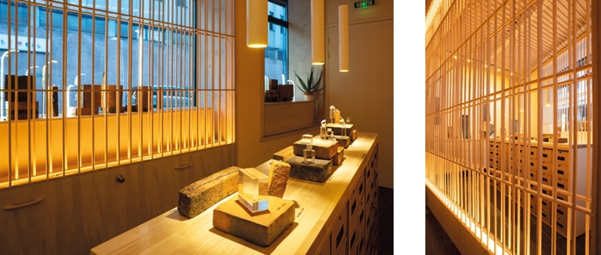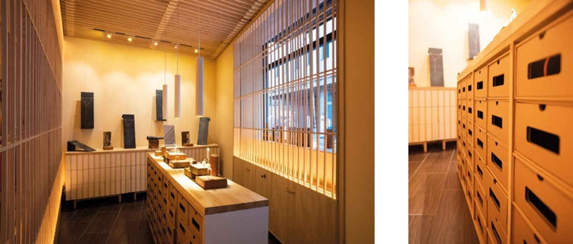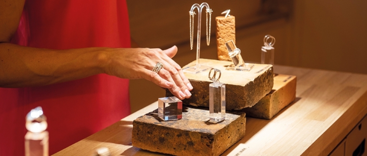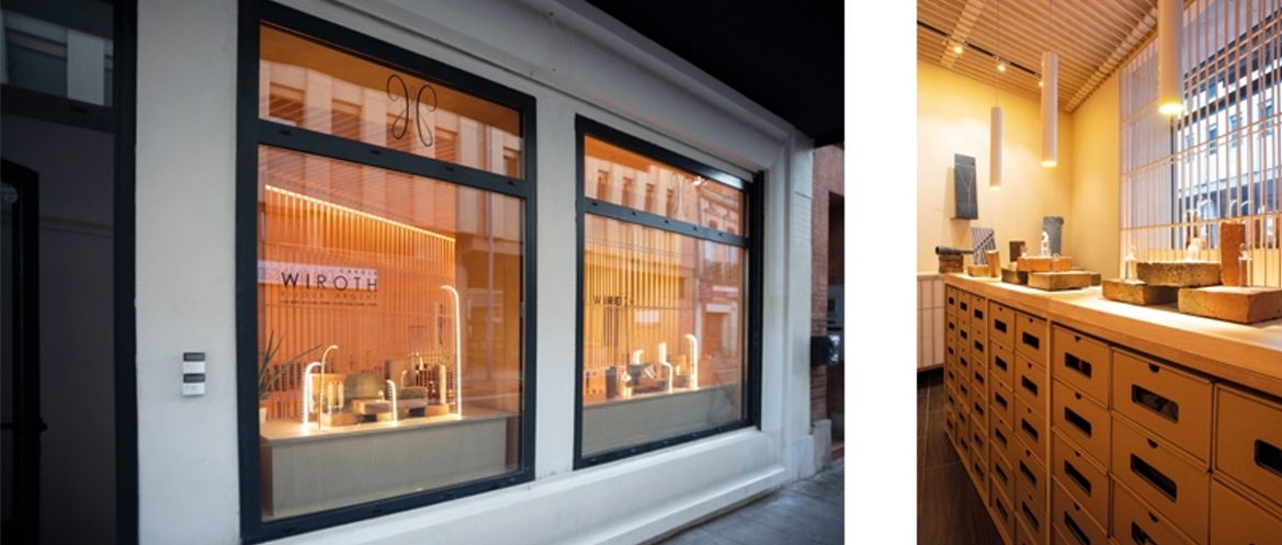 Dans le gris de la rue du Pont Saint- Pierre, un éclat de lumière doré, une pause. Deux grandes vitrines donnent à voir un écrin organisé avec minutie. Soudain une flamme apparaît en fond ; ici on soude, on martèle, on façonne la matière. On fabrique des bijoux. A l’intérieur, le tumulte de la rue s’efface et le décor se révèle. Les filtres de lumière structurent l’espace et l’enveloppent d’une atmosphère dorée qui contraste avec l’argent des bagues, des bracelets. Ici l’architecture n’est pas là simplement comme un décor destiné à servir de support aux bijoux. Elle révèle le rapport intime qui existe entre la lumière et la matière.
