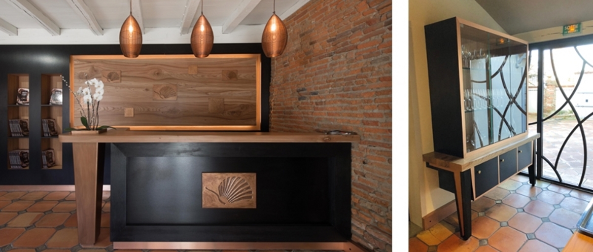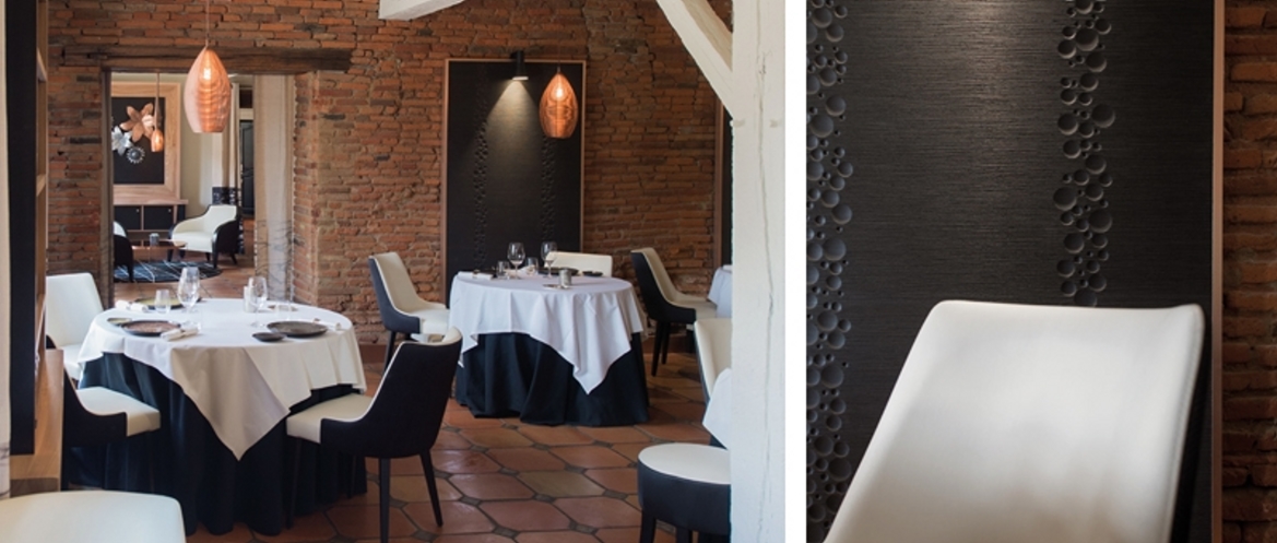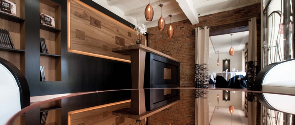 L’objectif du projet fût d’atténuer l’omniprésence du sol en tomettes et cabochons, de créer un vrai accueil, de changer l’ambiance patine de beiges et mobilier esprit ‘’brocante’’. Choix alors dirigé vers une atmosphère chaleureuse avec des touches de cuivre, clin d’oeil aux emblématiques casseroles, et à l’identité forte d’un mobilier sur-mesure associant du bois brut d’Ormeau à du noir. L’idée étant d’harmoniser l’ensemble et de faire circuler matières et couleurs à différents points stratégiques. Création d’un jeu de matières allant des cuivres cirés chiffonnés, martelés, brossés, au bois brut verni mat ou strié relief bulles effervescentes. Fauteuils et banquettes s’habillent d’un tissu broché noir reflets cuivrés rappelant le logo et une assise ivoire. Le travail artisanal de ferronnerie de l’entrée est reproduit sur trois postes : l’ouverture terrasse, la vitrine des Michelin et sur le gardecorps de la cave à vin. Au final, l’espace d’accueil a une vraie fonction et une identité propre, avec un comptoir, une bibliothèque et un petit salon d’attente. L’ensemble des salles suivent les mêmes codes déco avec la création de panneaux muraux intégrant le logo patiné. In fine un design unique dédié.