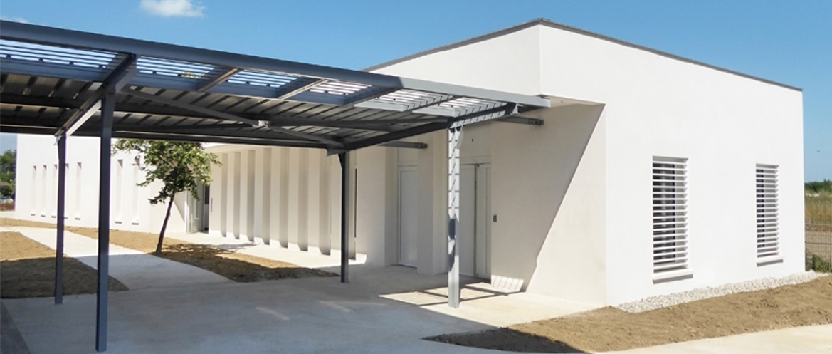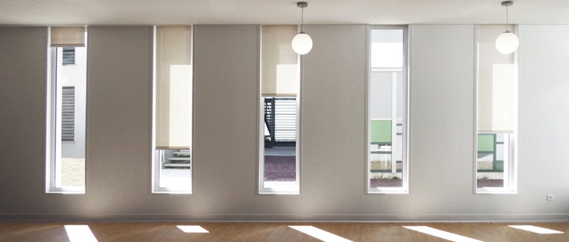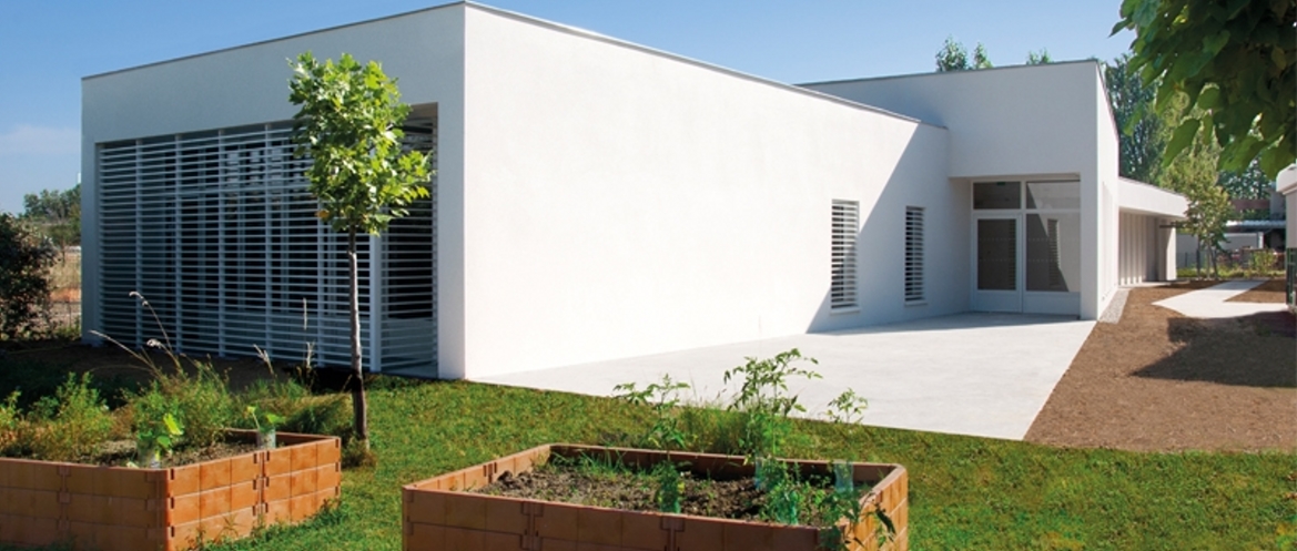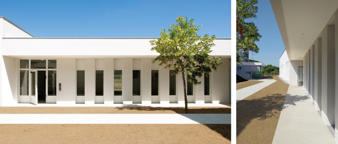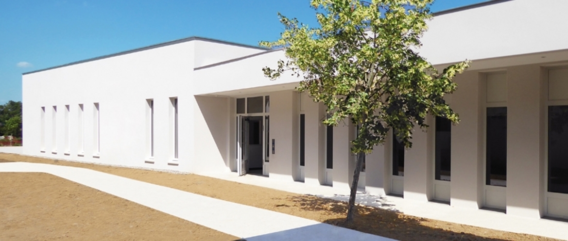L’hôpital de jour du Domaine de la Cadène s’inscrit dans une démarche d’ergothérapie centrée sur l’individu. Ainsi, maîtrise d’ouvrage et maître d’oeuvre ont été amenés à collaborer dès la programmation. Le bâtiment a été conçu dans l’optique de créer un environnement familier et apaisant afin de permettre à des personnes âgées présentant des incapacités de se réadapter à leur propre environnement. La volumétrie simple, en enduit blanc, s’étend en longueur en suivant la morphologie de la parcelle et s’ouvre sur le jardin thérapeutique à l’ouest. Un volume central, plus haut symbolisant la salle d’accueil intérieure et dissimulant les équipements techniques en toiture, vient rompre avec la linéarité de l’ensemble. Les façades sont rythmées par de larges percements aux caractéristiques différentes suivant les orientations, les vis-à-vis et les ambiances intérieures souhaitées. Des ventelles aluminium blanches protègent du soleil et des vues extérieures. Les pièces de vie intérieures, salle d’accueil, ateliers et bureaux sont caractérisées par leur aspect domestique : sol souple imitation parquet, stores, luminaires. (Conception au sein de am architectes).
