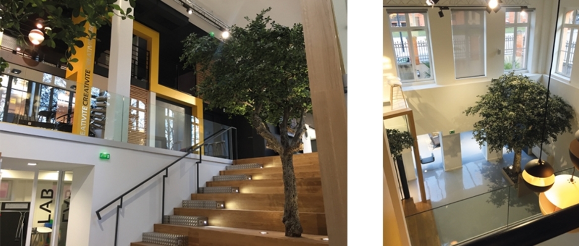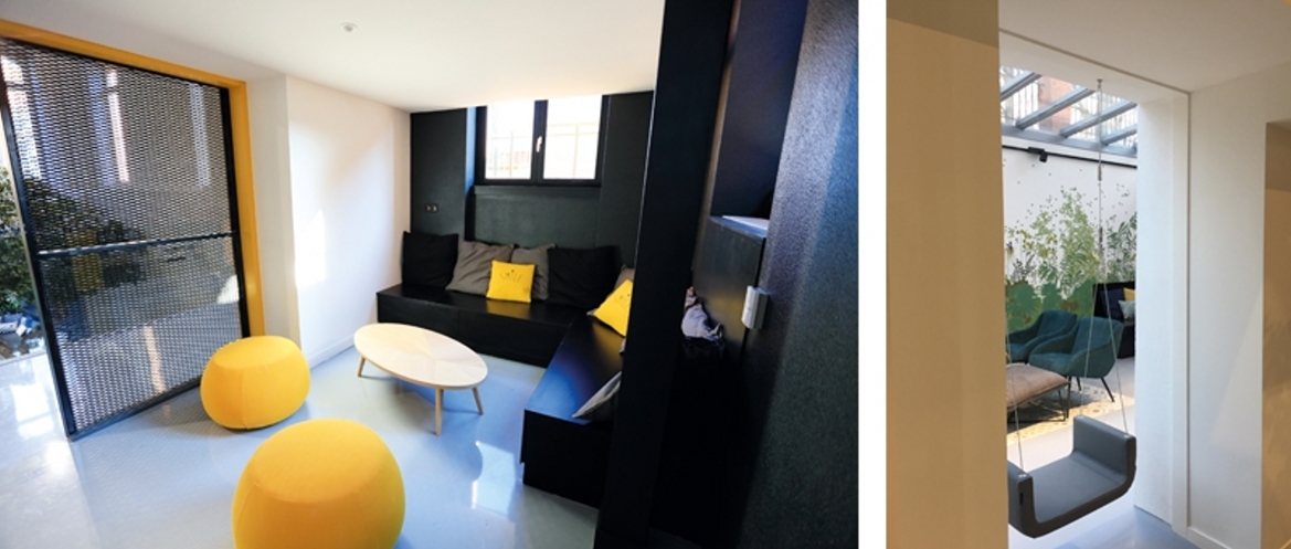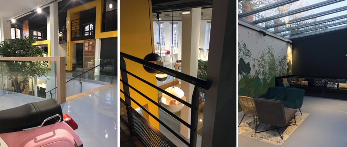 L’ancien bâtiment de la cour des comptes sur les allées Jules Guesde, aux portes du jardin des plantes, s’est refait peau neuve il y a un peu plus d’un an et s’offre une nouvelle vie et une nouvelle dynamique. Initié par le Crédit Agricole pour créer un lieu adapté aux nouveaux modes de travail il y accueille aujourd’hui les start’up innovantes de la région pour les aider à se lancer. Le projet a été mené par l’agence ABC Architecture, Hervé Saintis, architecte du projet s’est associé à Céline Loubière, pour s’occuper de la partie aménagement décoration, conscients du besoin de faire prendre une vie particulière à cet espace de travail. S'il offre 3 étages de plateaux de bureaux à la disposition des start’up, la place du village reste le point central du projet, son point d’ancrage, offrant un volume d’accueil et d’échange destiné à la création, qui s’étale sur 3 niveaux communicants par le large escalier amphithéâtre servant à la fois de lieu de convivialité et de conférences, le tout dans un univers « Village » avec des arbres, un scooter, une balançoire, un baby foot, et offrant par un jeu de mezzanines et de claustras un ensemble de petits espaces pour des réunions informelles, des modules de travail comme chez soi, mais tous ensemble dans cet univers pour un maximum d’échange et de créativité en toute liberté et en pleine dynamique.