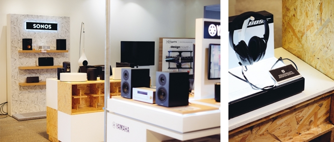 Une nouvelle trajectoire est prise par Sonology en 2018, anciennement Auditorium 26, et pour accompagner celle-ci, Boomerang Architectes, qui en connait un rayon en matière de changement de trajectoire, a opéré, CQFD ! Pulp, architectes d’intérieur a soutenu la démarche et a emboîté le pas. Une mutation en site occupé pour changer d’image était la donnée de base, pour proposer un nouveau concept de point de vente autour du son et de l’image. Nous avons alors imaginé un module. Simple. Brut ! Rapidement duplicable, facilement déclinable et à volonté. Nous ne nous en sommes pas privés : banque d’accueil ou vitrines, sont les rejetons de cette petite idée poussée à son extrême, mais cette apparente simplicité est inversement proportionnelle à sa mise au point. Le résultat est alors un module de 45 cm x 45 cm x 145 cm en OSB, tantôt naturel, tantôt laqué blanc. Les assemblages visibles, le module est utilisable dans tous les sens et toutes les configurations, que ce soit en banc ou en présentoir, horizontal ou vertical, superposable ou pas. Bref, une petite boite, en guise de réponse pour apporter une note chic et élégante, grâce au travail délicat d’un certain menuisier, un travail d’équipe en somme. Ainsi, Sonology dispose d’un outil fonctionnel, modulable à l’infini, les ingrédients sont réunis pour marier le service et l’expérience désirée par le client et c’est bien ce qui importe.