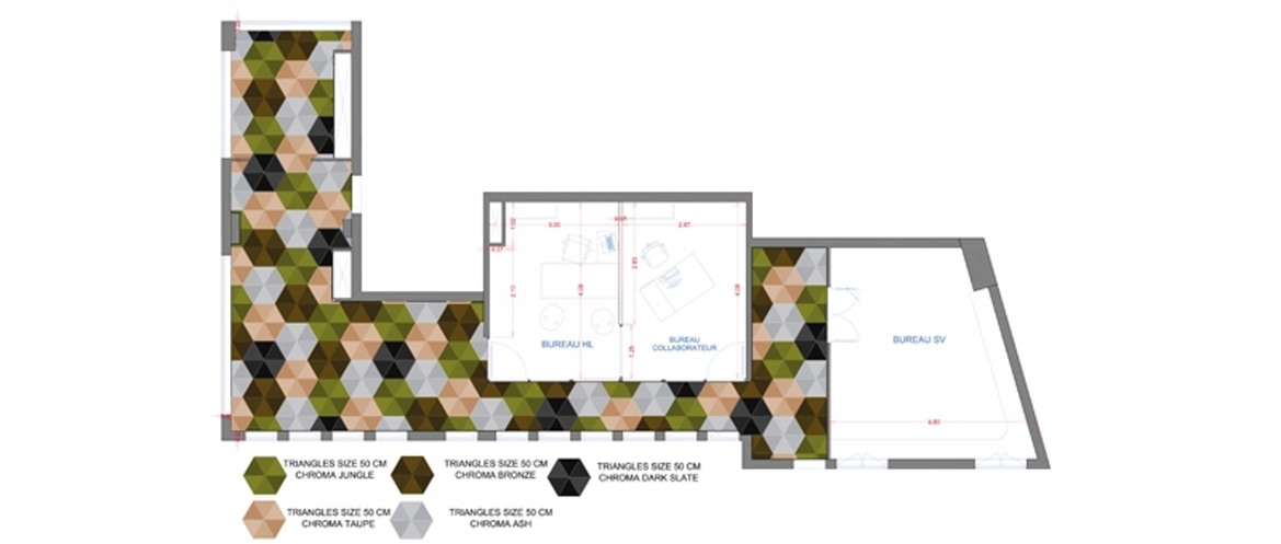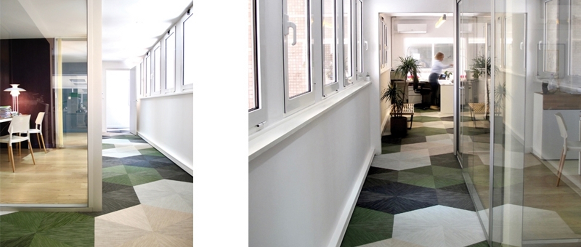 Quatre bureaux à trouver dans un espace qui s’apparente à un couloir. La solution retenue a été d’effacer les murs et de délimiter les espaces avec un contraste de sol. Une géométrie puissante pour les circulations et un sol bois clair et chaleureux pour les bureaux. Le cloisonnement vitré permet de garder la sensation d’espace.