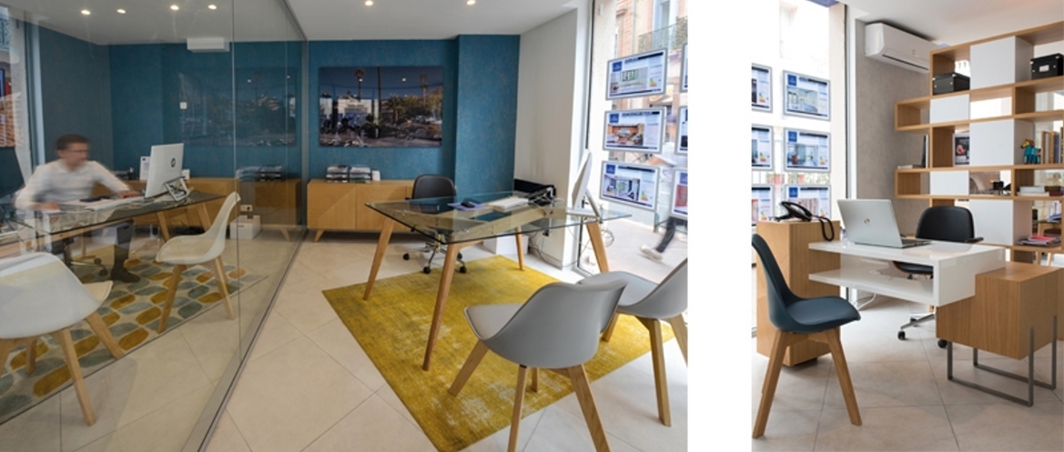 L’agence souhaitait donner une ambiance domestique et chaleureuse, un endroit où l’on se sente à l’aise tout en ayant une identité forte. La mission de l’architecte en plus de la conception et l’aménagement de ce grand carré, a été d’accompagner les propriétaires dans le choix du mobilier, des couleurs, des textiles. Faute de trouver un meuble pour l’accueil, il a été dessiné sur mesure pour s’adapter à son emplacement et rester cohérent face aux autres meubles de l’agence