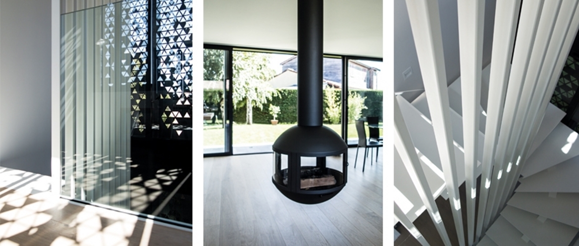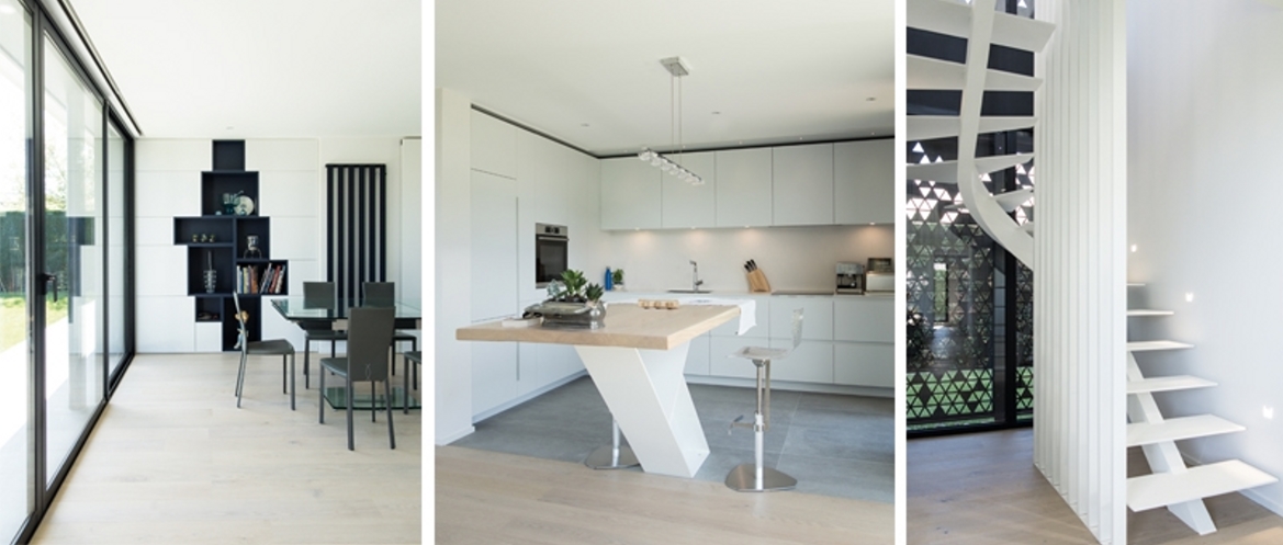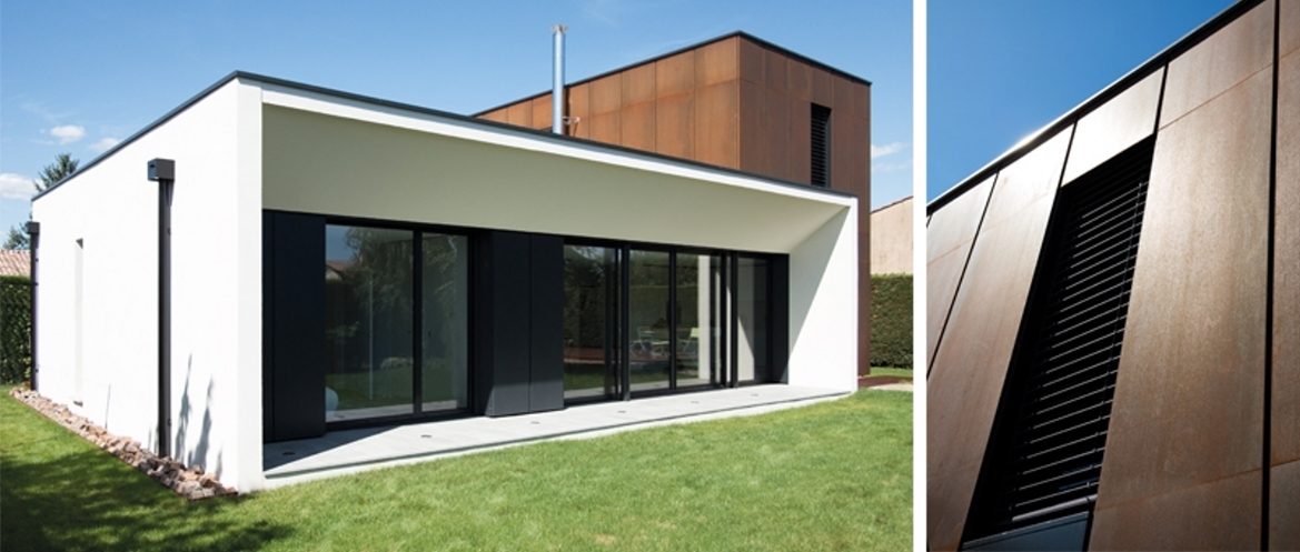 Ce projet consiste en la surélévation partielle d’une maison, ainsi que sa rénovation complète. La toiture existante en fermettes et tuiles mécaniques a été remplacée par un toit terrasse, le maître d’ouvrage souhaitant donner un aspect plus contemporain à la maison. Le rez-de-chaussée a été réorganisé afin d’aménager un espace de vie spacieux et traversant, largement ouvert sur le jardin. Sur la façade sud, une coursive a été créée afin de protéger la maison du soleil. Le volume surélevé est habillé d’un bardage métallique en acier corten qui vient contraster avec l’enduit blanc du reste de la maison. Les ouvertures du volume en corten sont protégées par des occultations ajourées, faisant penser à des moucharabiehs. Ces derniers protègent l’intimité de la maison, mais aussi celle des parcelles voisines. De jour, ceux-ci créent un jeu d’ombres et de lumière à l’intérieur. A l’inverse, à la nuit tombée, la lumière intérieure se diffuse à travers les moucharabiehs, tel un photophore, offrant une lecture en négatif du bâtiment.