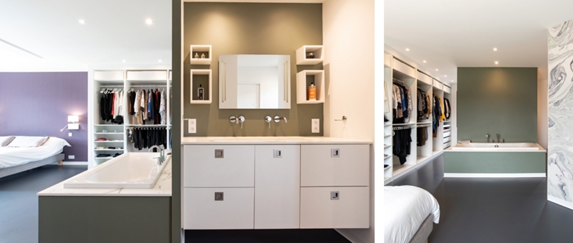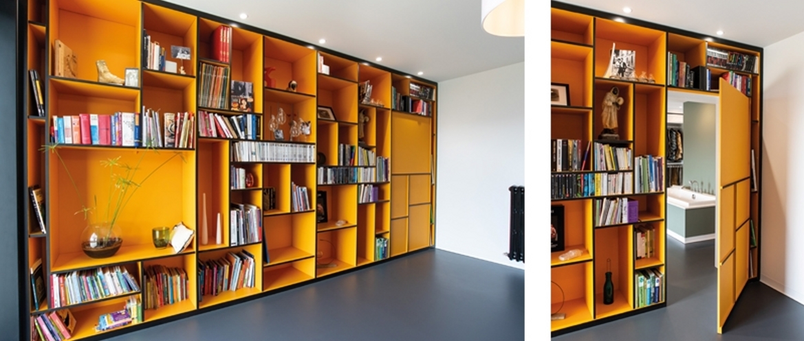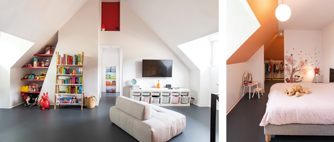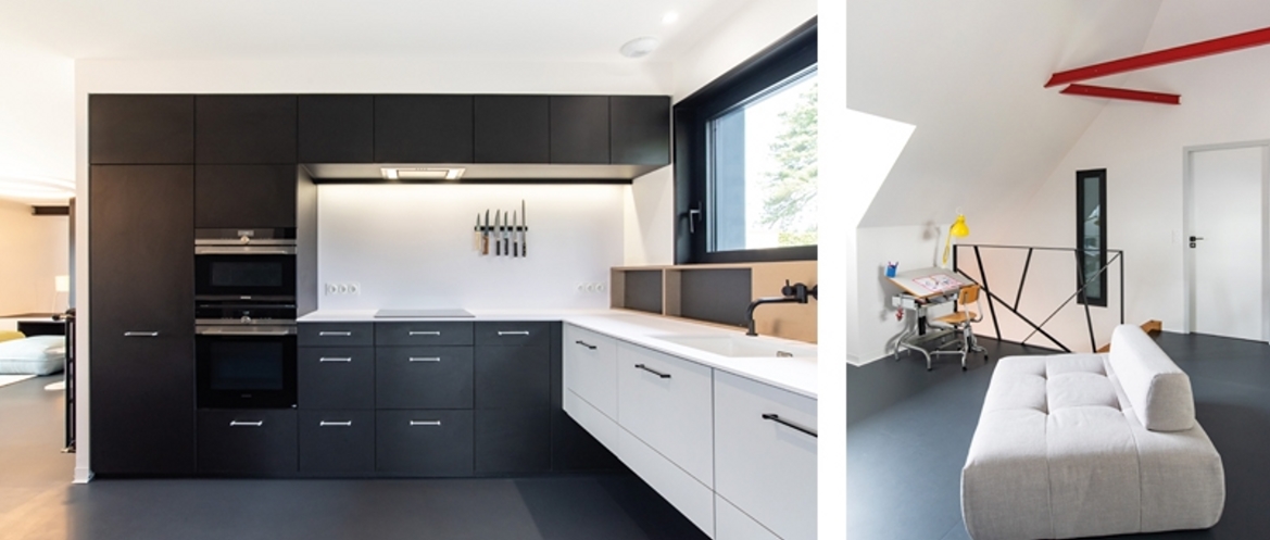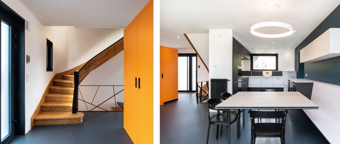 Réappropriation d’une maison familiale des années 70. Le premier objectif fut la rénovation énergétique de la maison. Des principes Feng shui ont été étudiés pour cette réalisation. Les espaces sont épurés, les énergies circulent. Perchée sur les hauteurs avec une vue sur la vallée et la montagne, la maison familiale a un second objectif : profiter au maximum du panorama et de la lumière en créant une grande ouverture de 4 mètres à galandage et des cadrages avec des châssis fixes dans chacune des pièces du rez-de-chaussée. Cette baie une fois dissimulée dans le mur offre un espace commun, une continuité entre l’intérieur et l’extérieur. Les limites physiques n’existent plus. Au niveau circulation, l’accent s’est porté sur la fluidité des espaces. Ils sont organisés de façons distincte mais ils communiquent tous les uns avec les autres. Les maîtres d’ouvrage souhaitaient pouvoir échanger et être vus de tous les espaces de vie. Les portes sont réservées pour les coins nuit. D’ailleurs la seule porte donnant sur l’espace de vie est dissimulée dans le meuble bibliothèque, élément majeur dans la pièce. Cette porte dissimulée permet de préserver l’intimité de la chambre parentale.