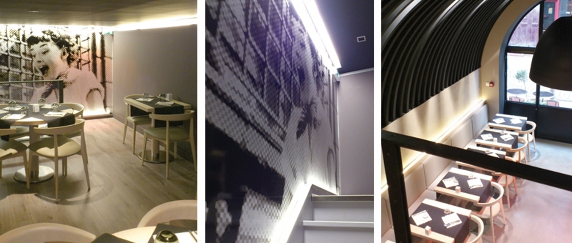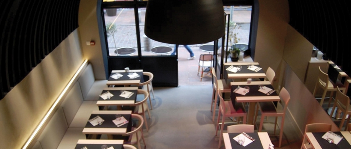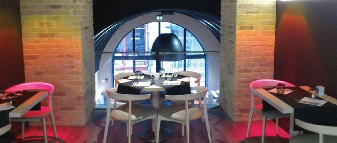 Restructuration et aménagement d’un restaurant. Mise en scène d’une mezzanine Expression d’une voûte. Eclairage : collaboration avec Deltalight.