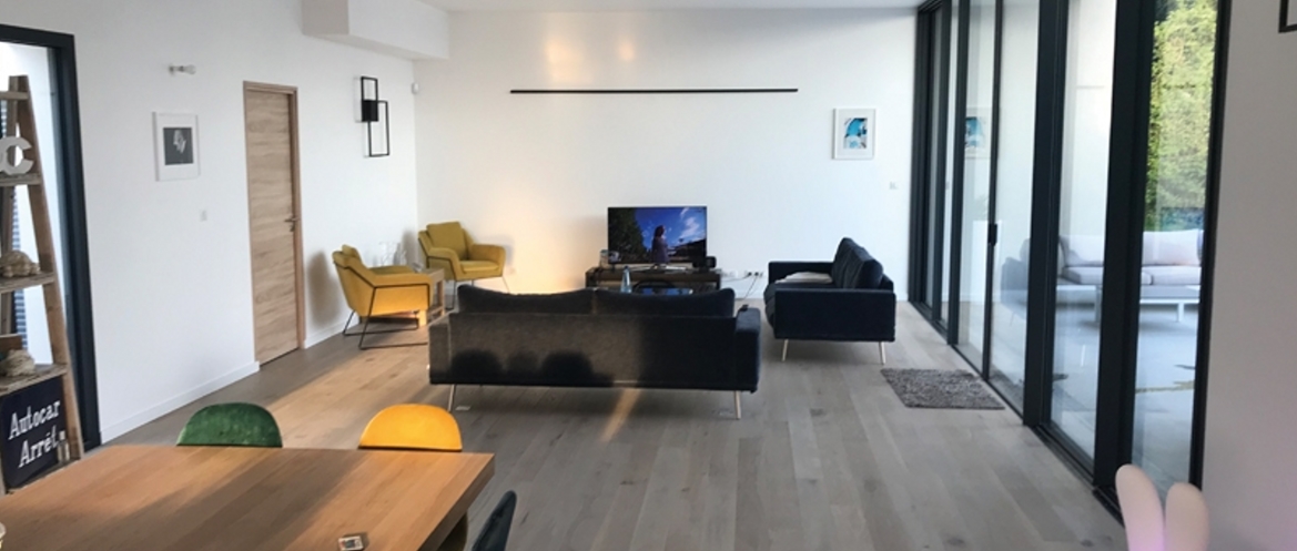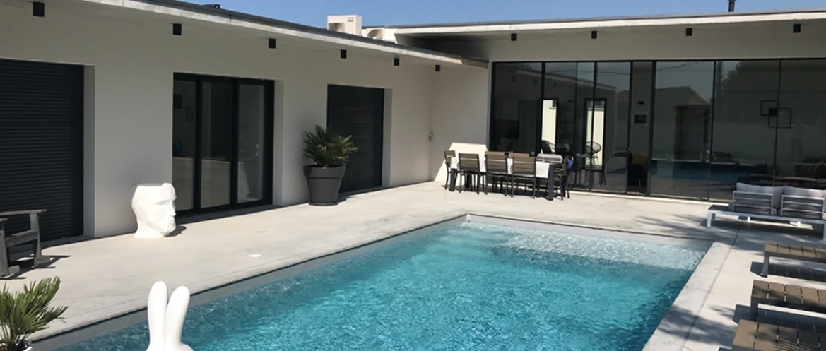 Le projet consiste en la réalisation d’une maison contemporaine de plain-pied à Balma. Cette habitation se situe dans un petit lotissement. Ce programme simple se compose d’une grande pièce à vivre, d'une suite parentale, des chambres d’enfants et d'un garage. La maison s’organise autour de l’espace à vivre, qui distribue l’ensemble des pièces. Cette habitation se compose de volumes simples formant un L qui entoure l’espace piscine. Les ouvertures sont orientées principalement sur cet espace pour favoriser l’intimité et faire rentrer la lumière. Un soin particulier a été donné à la qualité des espaces et les liens entre eux. Les matériaux utilisés sont simples et peu nombreux, béton poli et brut pour les casquettes et les terrasses, parquet chêne clair, cuisine blanche et chêne, murs blancs et menuiseries aluminium gris anthracite. L’ensemble des volumes blancs soulignés par des casquettes en béton donne une écriture contemporaine à cette maison.