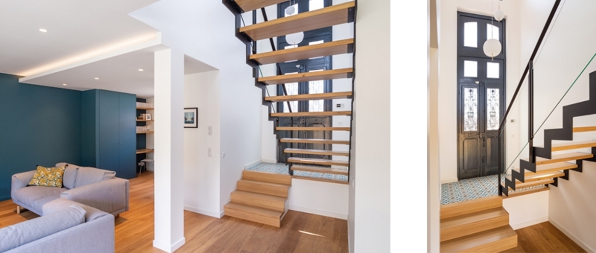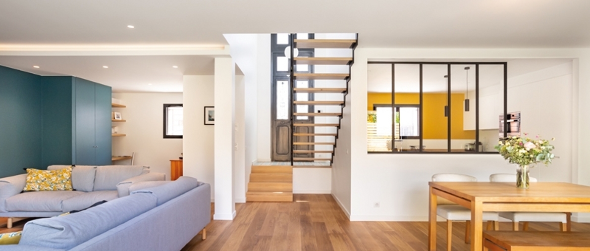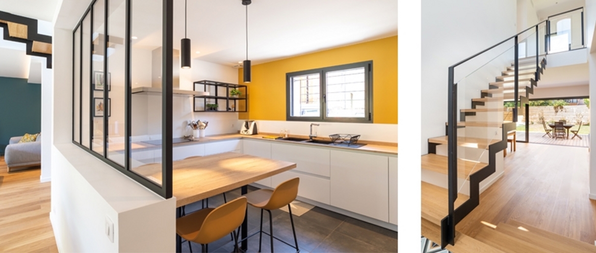 Dans le quartier des Minimes à Toulouse, l’Agence A&V TRAMOND Architectes a modernisé et agrandi cette Toulousaine à pignon caractéristique de l'architecture locale. L’enjeu de ce projet était de transformer cette maison composée initialement de 3 niveaux de faible hauteur sous plafond, avec des pièces de vie en étage en une maison ouverte sur son jardin jusque-là inexploité. Il a donc été supprimé un plancher intermédiaire pour permettre de descendre les pièces de vie en relation directe avec le jardin, la terrasse et la nouvelle piscine. Les espaces de vie au rez-de-chaussée et espace nuit au R+1 sont ainsi bien définis. Autre enjeu de taille : faire rentrer la lumière. La maison étant orientée plein sud côté rue, nous avons recalibré les ouvertures existantes pour faire rentrer la lumière en profondeur dans la maison. Les briques d’encadrement des ouvertures existantes ont été rénovées et complétées. Véritable pièce maîtresse de la maison, l’escalier à double limon crémaillère en métal et marches en chêne permet d’accéder à l’étage en conservant une transparence vers le jardin dès l’ouverture de la porte d’entrée. Briques foraines, carreaux ciments, verrière en serrurerie, garde-corps en verre apportent une touche chaleureuse sur cette réalisation.