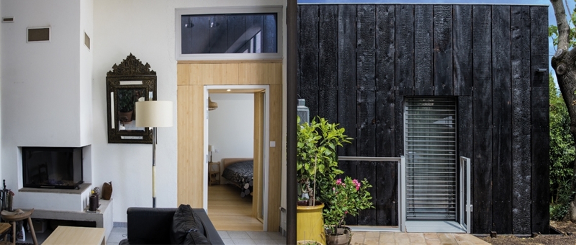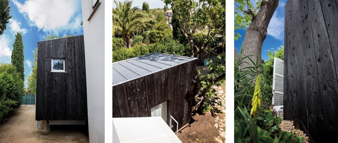 Architecture du quotidien. C’est dans un contexte de handicap qu’a vu le jour ce projet. Une réponse maîtrisée devait être engagée en urgence pour améliorer le quotidien dans cette maison à plusieurs niveaux. Grâce à des convictions partagées et une synergie de l’ensemble d’une famille et des artisans, nous avons pu définir rapidement la mise en œuvre et le budget pour mener à bien ce projet. Urgence climatique : nous devons agir. La réponse d’une architecture écologique devient une priorité universelle. Nous avons pris le parti de réaliser ce volume de façon naturelle, immergé dans son jardin. Le bardage réalisé grâce à la technique japonaise de bois brûlé Shou-Sugi-Ban et l’intérieur en bambou expriment cet engagement. Pour une densité mesurée. Nous avons cherché ici à optimiser la surface constructible restante de la parcelle. L’intervention consiste à additionner un volume (chambre + salle de bains) en rez-de-chaussée de la maison sur la partie la plus simple à transformer.