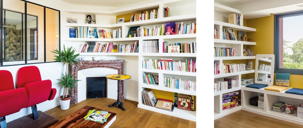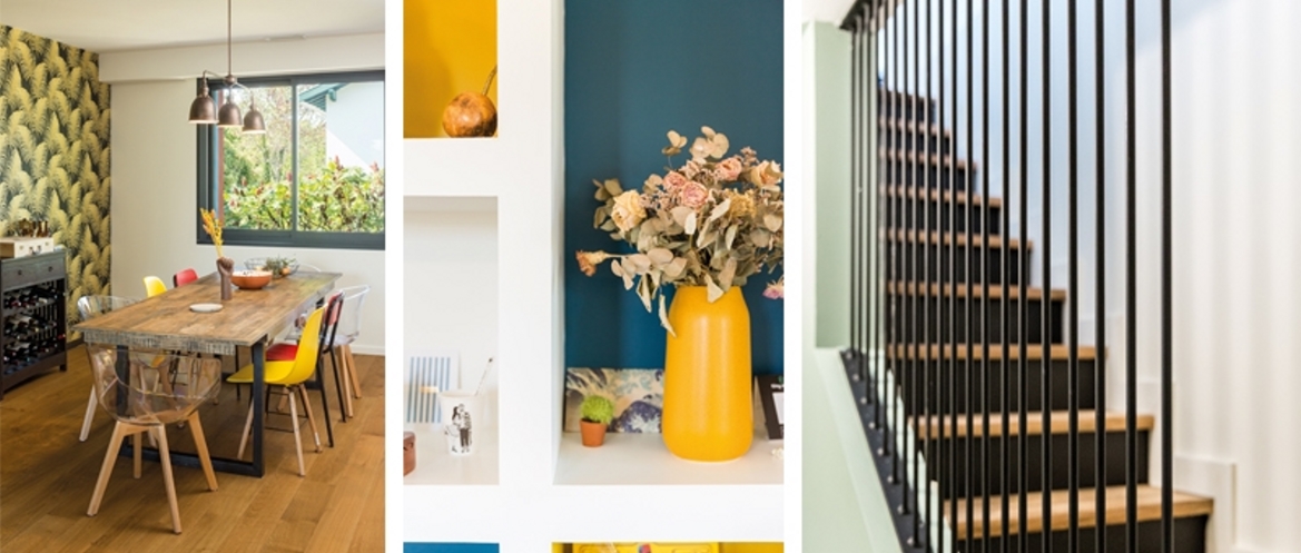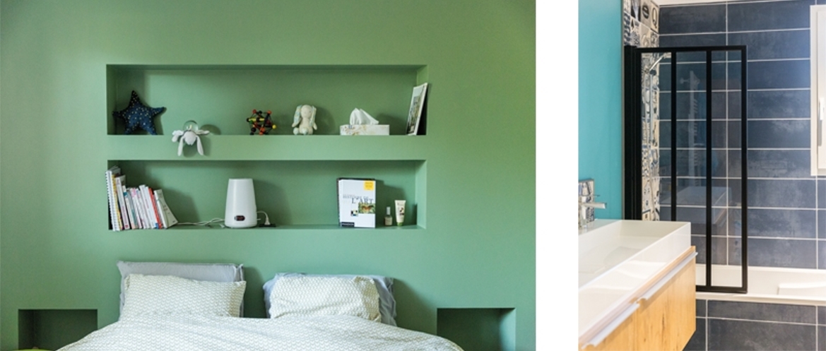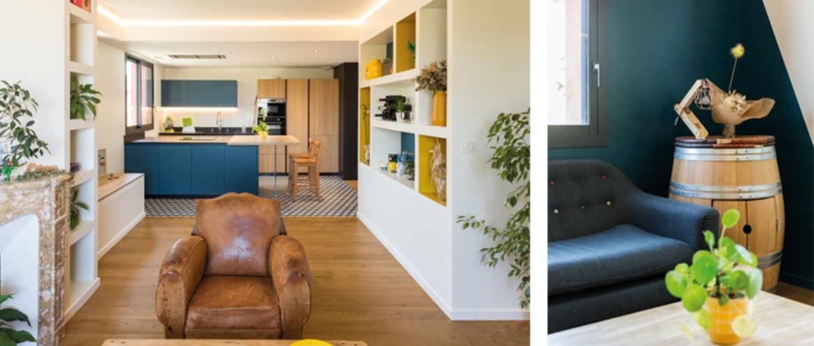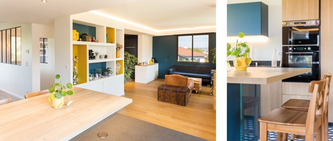 Rénovation complète de la maison. L’espace a été totalement restructuré avec l’ouverture de murs porteurs et la création de nouvelles fenêtres afin de redéfinir les espaces. Les rangements font partie des murs et se fondent dans la décoration grâce des niches en placo et des portes en médium peintes. À l’étage, un espace de vie totalement ouvert, tout en gardant des séparations visuelles comme la peinture au plafond dans le couloir et la différence de sol dans la cuisine. Cette dernière est mise en valeur par un îlot latéral servant d’espace repas et de cuisson. Deux grandes verrières dans la salle à manger et la bibliothèque apportent de la luminosité dans l’escalier et créent un lien entre les espaces. Une double porte à galandage permet d’accéder à la bibliothèque, réalisée sur mesure avec un espace banquette et un placard. Dans l’escalier qui mène à l’espace nuit, une structure tubulaire sert de garde-corps. Les chambres et pièces d’eau ont été imaginées dans le même esprit, avec des niches et des tablettes pour optimiser l’espace. Côté décoration, le bleu est le fil conducteur du projet dans toutes ses nuances. Contrasté par le jaune et le noir, adouci grâce au bois, un combo parfait.