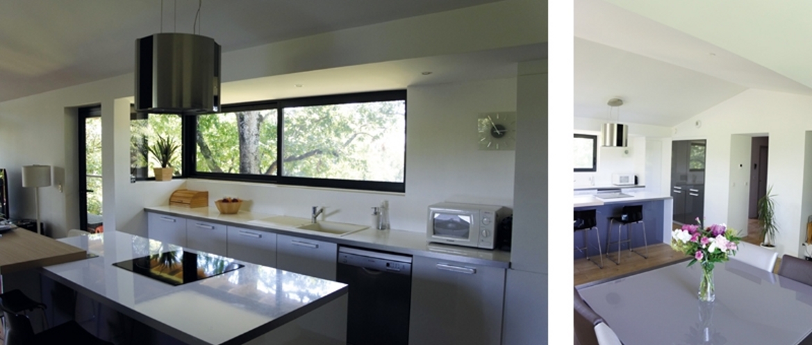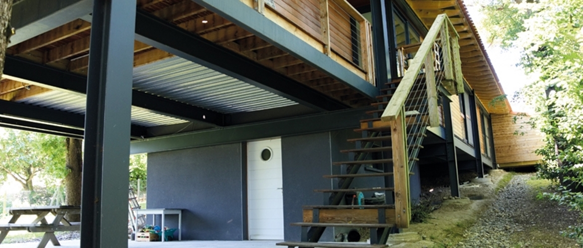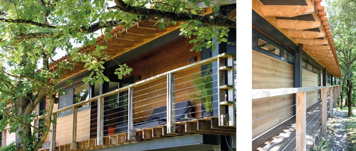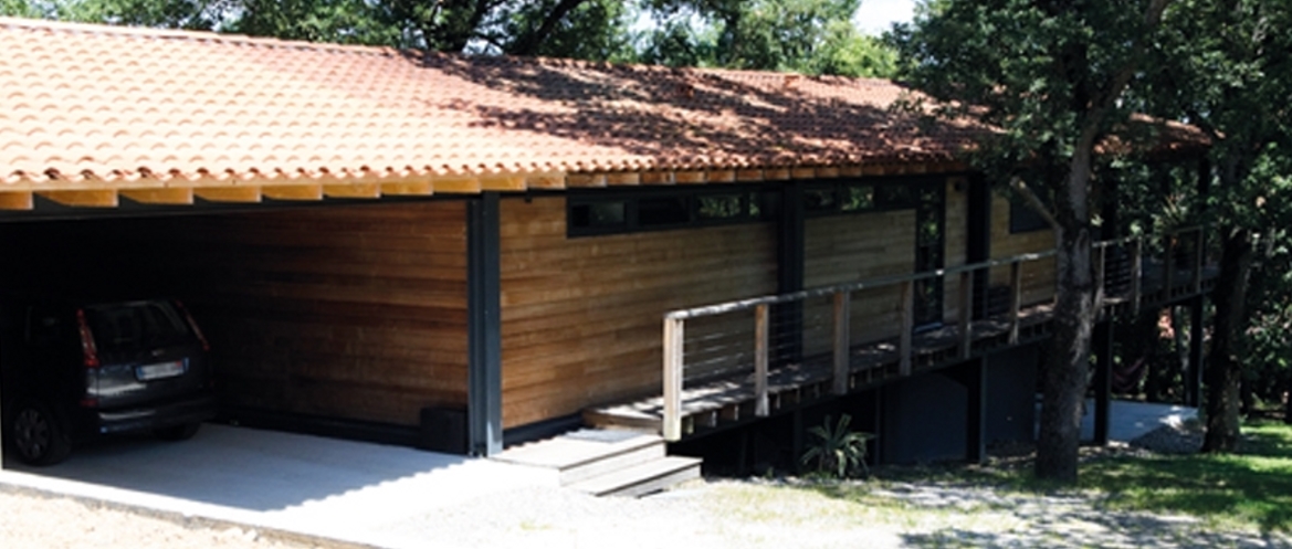 Au commencement il y eut quelques errements auprès de constructeurs, puis conscients de l’importance d’une conception en prise directe avec le milieu environnemental, les maîtres d’ouvrage s’intéressent finalement à notre travail d’architecte. Les toitures en tuile sont imposées par le règlement et inscrivent de facto le projet dans le modèle archétypal de la maison. La spécificité du projet réside dans son parti d’implantation et dans le rapport qu’entretient le bois avec les structures métal pour former un tout cohérent. Un volume de 32 m de longueur s’insère entre les arbres à hauteur des feuillages. L’accès se fait au contact du terrain en haut de la pente. Un parcours le long de la coursive mène à l’entrée et plus loin jusqu’à la terrasse suspendue. La préservation des arbres existants et de la topographie naturelle, est rendue possible par un système constructif minimisant les impacts des terrassements sur le site et faisant appel à des techniques de préfabrication en bois et métal. La végétation, changeante au gré des saisons, est omniprésente. Depuis la terrasse, en hiver, les lointains se dévoilent au travers des ramages. Au final des clients heureux !
