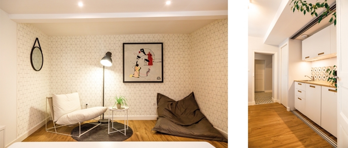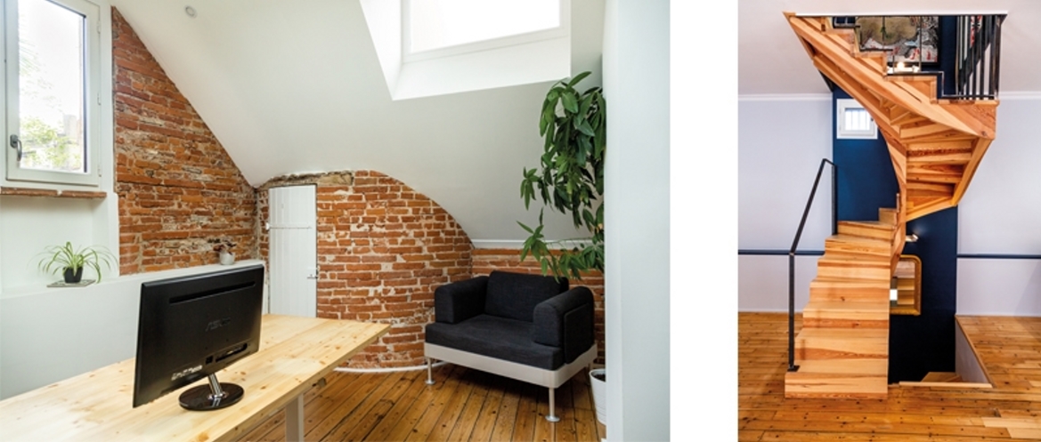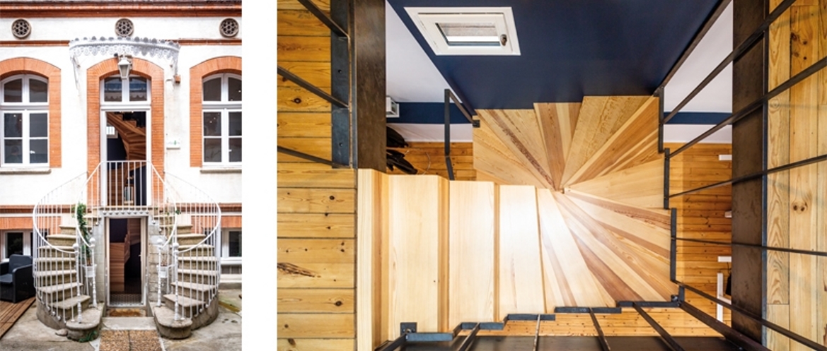 Nouvelle vie pour cette chartreuse de 1878 qui a été réhabilitée en bureaux. La volonté première fut de conserver le côté domestique de la maison qui avait tant séduit les acheteurs pour créer une ambiance de travail chaleureuse. Il a fallu ensuite décloisonner les espaces pour s’adapter à la demande de travail en open-space. L’escalier a été repensé et repositionné au centre, devenant ainsi la colonne vertébrale du projet. Il est accompagné d’un jeu de double hauteur dans le but d’accentuer sa verticalité, d’apporter de la lumière dans ce volume mono-orienté sur cour et de faciliter la communication au sein des bureaux. Le projet se développe donc sur trois niveaux allant des espaces les plus communs de l’entresol (réunion/cuisine/reprographie/sanitaires) aux espaces les plus privés des bureaux de la direction en combles. Ces dernières ont été entièrement rénovées dans le respect des matériaux d’origine.