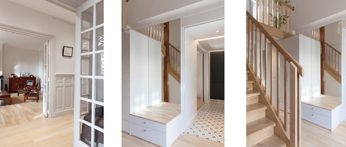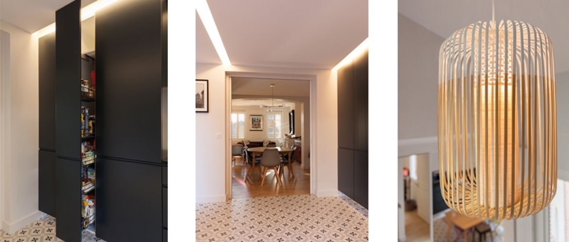 Le plancher du rez-de-jardin de cette villa présentait comme désordre important un fort affaissement ainsi qu’une absence totale d’isolation. Le plancher bois a été déposé au profit de la création d’un plancher moderne isolé. Afin d’amener davantage de lumière, d’harmoniser et de lier les espaces entre eux, d’agrandir la cuisine, de valoriser le volume du hall sur la double hauteur, d’augmenter les volumes de rangement et l’ergonomie des espaces, l’ensemble du niveau a été modifié et repensé. De larges ouvertures ont été créées entre les salons, la cuisine, le grand hall et le bureau, dessinant des perspectives intérieures et aussi des vues cadrées vers l’extérieur. L’apport accru de lumière se fait par des tons chauds et clairs sur les parois et par un clair de jour augmenté. La cuisine a été repensée pour augmenter le volume de rangement tout en libérant l’espace pour recevoir une table pour toute la famille. Sur la quasi-totalité, le sol reçoit un parquet en chêne massif ce qui harmonise et lie visuellement les différents espaces. Le sol de la cuisine reçoit un carrelage en grès aux motifs des années 20. L’éclairage intérieur est principalement indirect à l’exception de deux lustres.