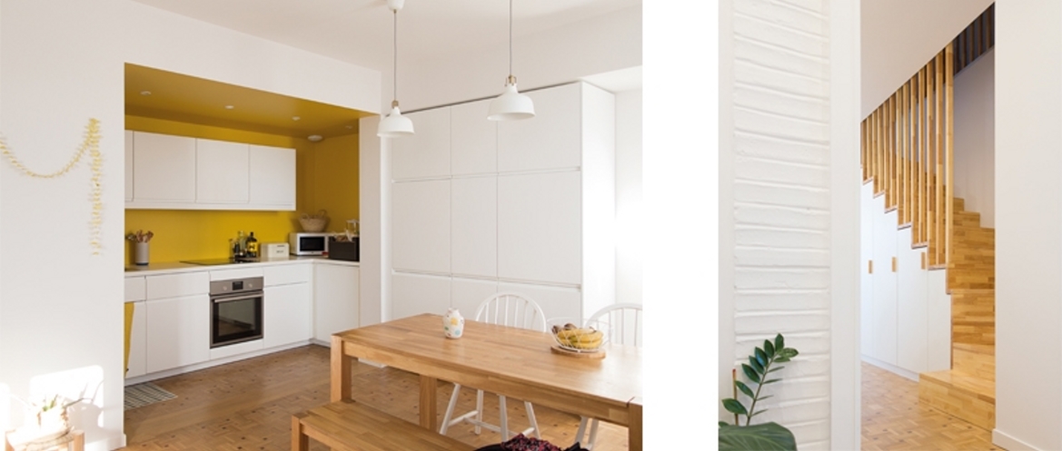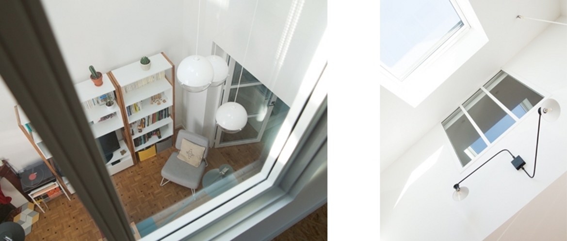 Le challenge de ce projet a été de créer une suite parentale dans les combles de la maison, sans pour autant la surélever. La hauteur sous plafond conséquente du rez-de-chaussée a pour cela été légèrement réduite, et un nouveau plancher et un escalier ont été construits. Le volume intérieur de la maison a été libéré de toutes cloisons, murs et planchers, et entièrement repensé. La maison souffrant de vis-à-vis importants, il n’était pas souhaitable d’agrandir les ouvertures existantes. Pour amener de la lumière tout en préservant l’intimité des habitants, de larges fenêtres de toit ont été installées, dans le séjour qui profite d’une double hauteur, et dans la chambre située sous rampants. La chambre bénéficie également d’une verrière, donnant sur la double hauteur du séjour, et sur laquelle sont axées les deux fenêtres de toit, baignant ainsi de lumière ces deux espaces. Malgré ces lourds travaux et afin de préserver le caractère du lieu, les parquets, les portes, les cheminées et les radiateurs existants ont été conservés.