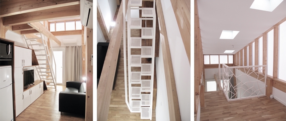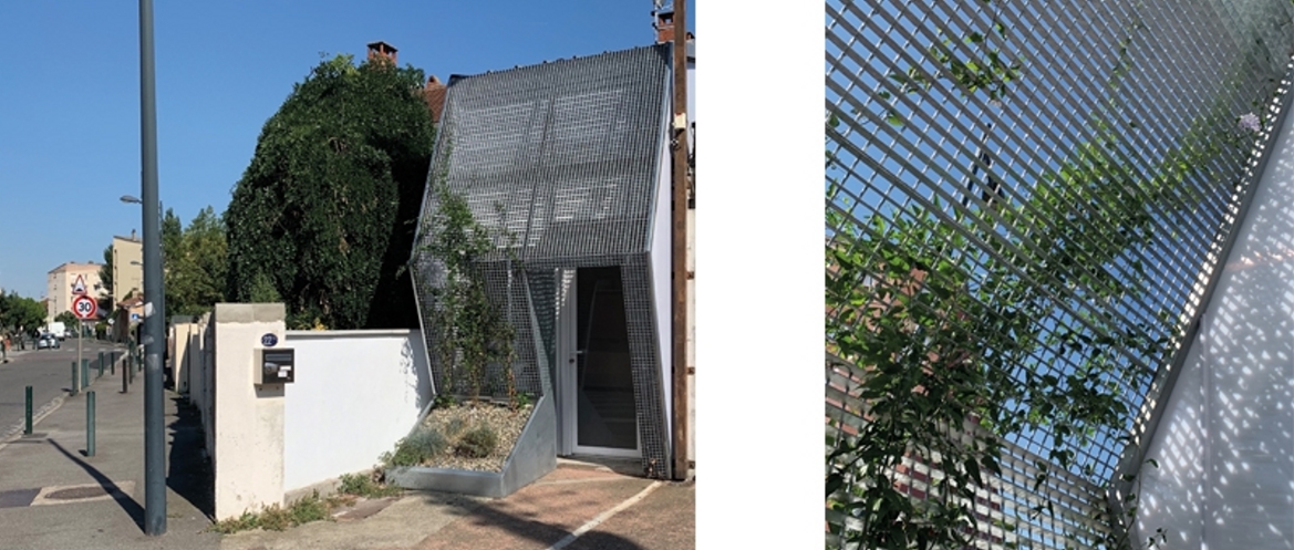 Nous ne sommes pas à Tokyo mais à Toulouse avec une parcelle extrêmement exiguë, 2 m30 pour 15 m de long et une seule fenêtre sur une rue très passante... Pour pallier au manque de lumière le projet va surélever l'ancien cabinet de podologie avec des murs translucides. Une ossature bois laissée apparente habillée de polycarbonate permettra de baigner l'ensemble du logement dans une douce lumière opalescente. On a ainsi 2 chambres, une « grande » mezzanine en connexion avec le séjour en rez-de-chaussé en double hauteur. La seule façade du logement qui le sépare d'une rue bruyante est pliée avec un treillis métallique afin de créer une « poche d'air » offrant un recul de 70 cm devant la baie vitrée. Une jardinière intégrée à la façade permettra à des plantes grimpantes de coloniser l'ensemble du treillis filtrant la vue sur la rue comme si l'on se trouvait derrière un bosquet, voir sans être vu.