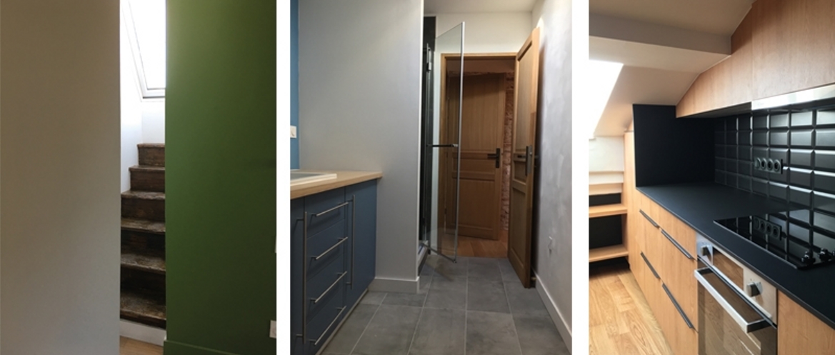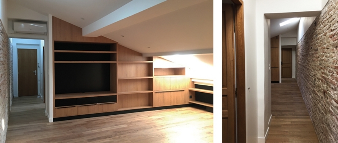 En haut de la tourelle, au 4ème étage de cet immeuble toulousain du début XIXe siècle, trois anciennes " chambres de bonne " attendaient d'être restructurées en un bel appartement. Ce projet de rénovation se veut être respectueux de l’ensemble existant ; il consiste à réaménager entièrement l'intérieur du niveau implanté sous les toits de l'aile gauche de l'immeuble, côté cour. Les 3 fenêtres en chien assis apportent avec les petites fenêtres de toit une clarté nécessaire et la micro-terrasse accessible depuis la chambre offre une vue imprenable sur le clocher de Saint-Sernin. Le mobilier et les rangements réalisés sur mesure permettent d'optimiser l'espace tout en assurant leur usage malgré le rampant. Le moindre espace est exploité grâce à des lignes d'étagères qui prolongent la bibliothèque jusqu'à la cuisine en vis-à-vis. Le mur en brique conservé redonne au lieu une mémoire tout en distribuant les espaces réalisés et le parquet de chêne harmonise les matériaux employés.