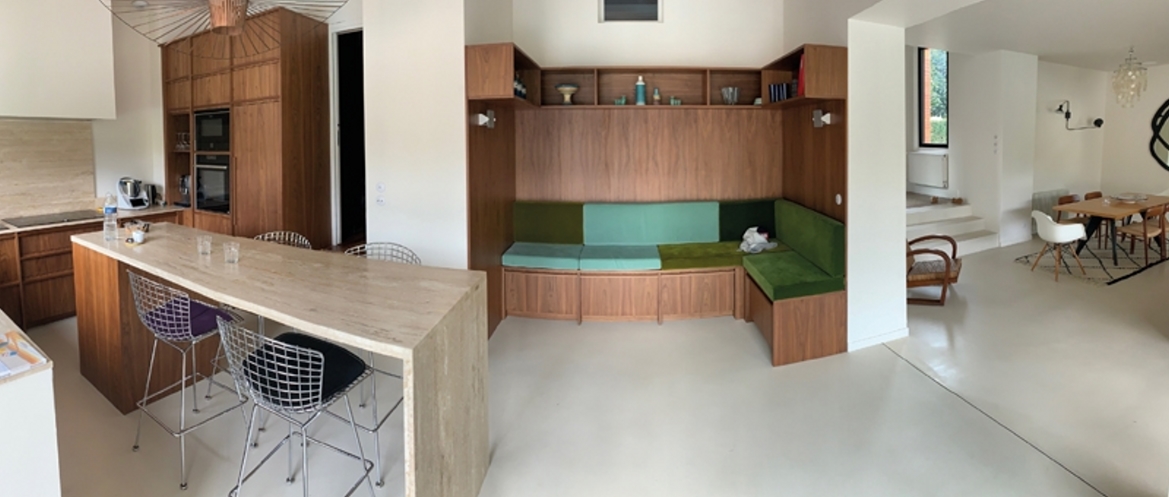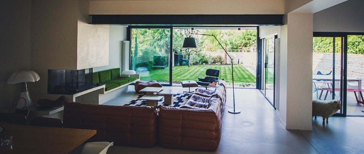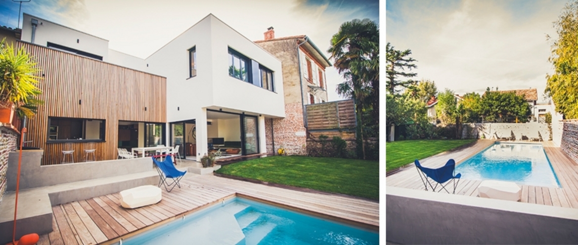 La maison existante est située dans le quartier de la Côte Pavée. La façade sur rue est très qualitative et a été intégralement conservée, de même que les volumes intérieurs côté rue, traités et rénovés avec leur charme d’antan. Cela ne laisse nullement soupçonner l’extension qui est située côté jardin, avec des volumes contemporains, spacieux et très lumineux. La façade arrière existante étant sans réel intérêt, toute l’extension contemporaine a été faite en ossature bois, pour des raisons d’accès chantier, puis traitée avec des enduits blancs et du bardage à claire-voie en Red Cedar. Toutes les chambres, le salon et la cuisine se trouvent orientés vers le jardin et la piscine dont l’ensemble a été complètement repensé. Les murs en briques et galets ont été découverts et restaurés. Ils se marient harmonieusement avec la façade en Red Cedar, le caillebotis des terrasses, le béton ciré des banquettes et le jardin. Cette maison propose aujourd’hui un parcours équilibré entre ses volumes d’origine et son extension très perméable. Les lieux sont traversants et fluides. Ils offrent une quiétude particulière menant au petit jardin, à la piscine ; espaces tout aussi soignés et agréables. Projet réalisé avec Dominique CHA, décoratrice d’intérieur.