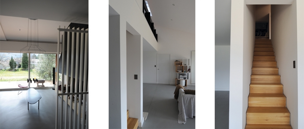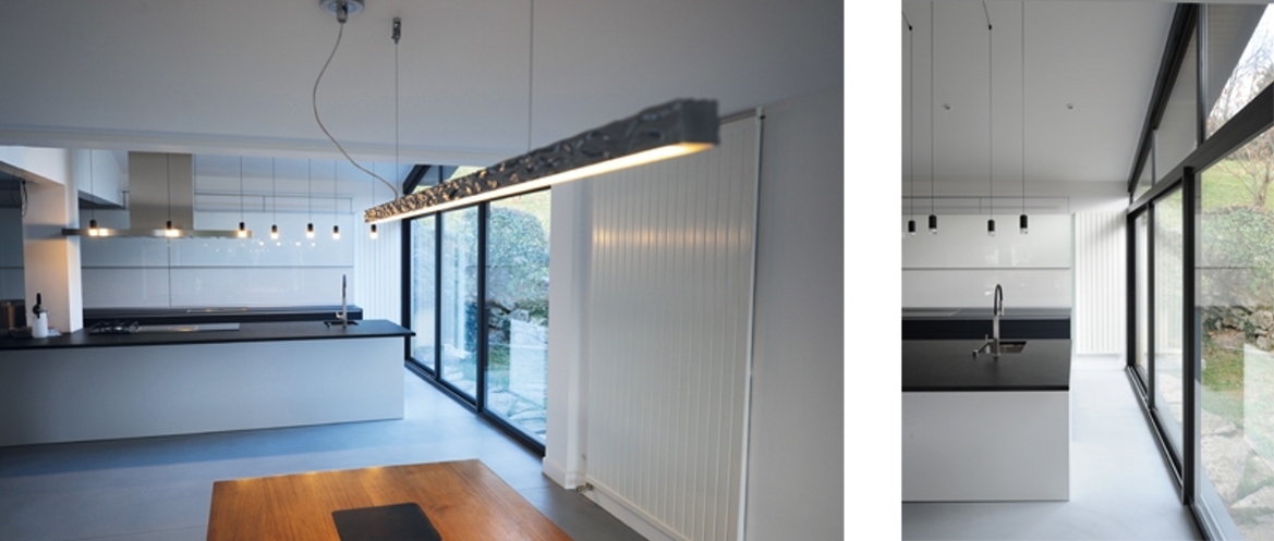 La maison se situe à Saint-Girons, au sud de Toulouse, département de l’Ariège. Elle a été conçue en 1973 par un architecte et offre un style contemporain. Le programme demandé par les propriétaires était d’agrandir la cuisine, qui à l’époque était pensée de petite taille. Les travaux furent l’occasion de repenser l’isolation thermique globale. La terrasse extérieure qui jouxtait la cuisine, fut donc investie pour agrandir celle-ci, dans le prolongement de la salle à manger existante. Le parti pris de faire un îlot central s’est imposé par l’importance des propriétaires, au temps consacré à cuisiner et à recevoir. Cet espace donne donc à voir l’art de cuisiner, de goûter ensemble autour d’un plan de travail en pierre locale où sont disposés les feux, avant de s’installer dans la salle à manger, avec vue sur jardin. L’intervention de la coloriste A. Delmas, a permis de souligner en noir certains éléments, afin de mieux écrire les lignes et les volumes. Chaque espace à son propre volume, défini par les plafonds rampants ou ceux de la mezzanine. Le sol en béton ciré donne l’unité des lieux et fait résonner l’ensemble de ces espaces ouverts.