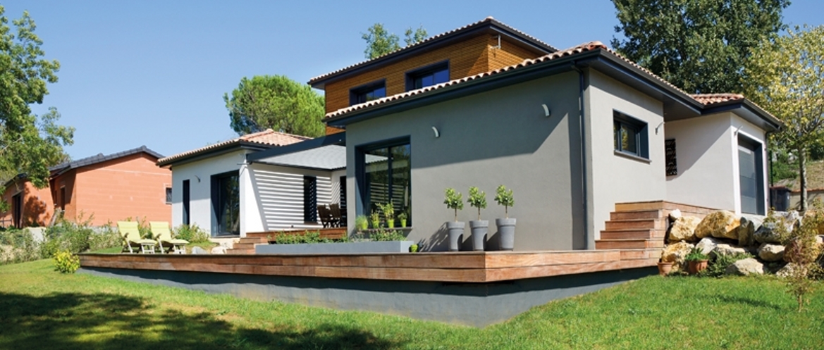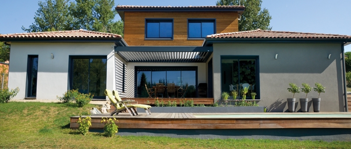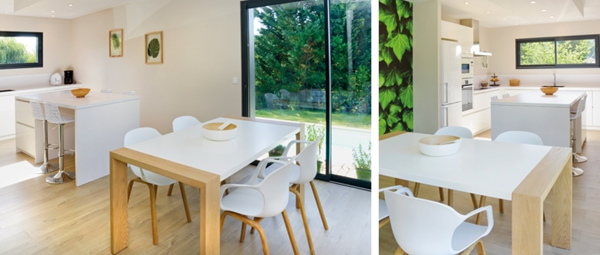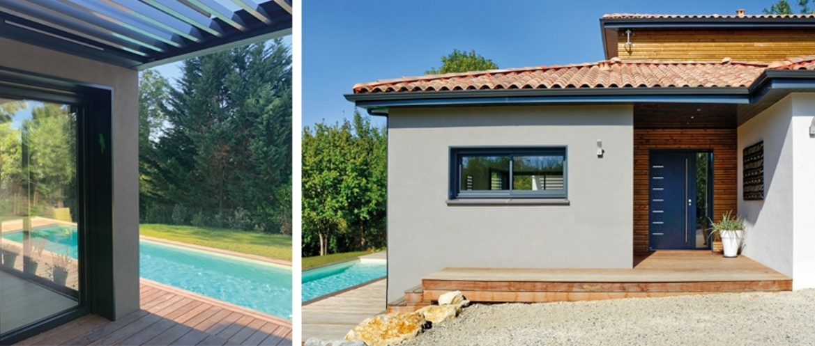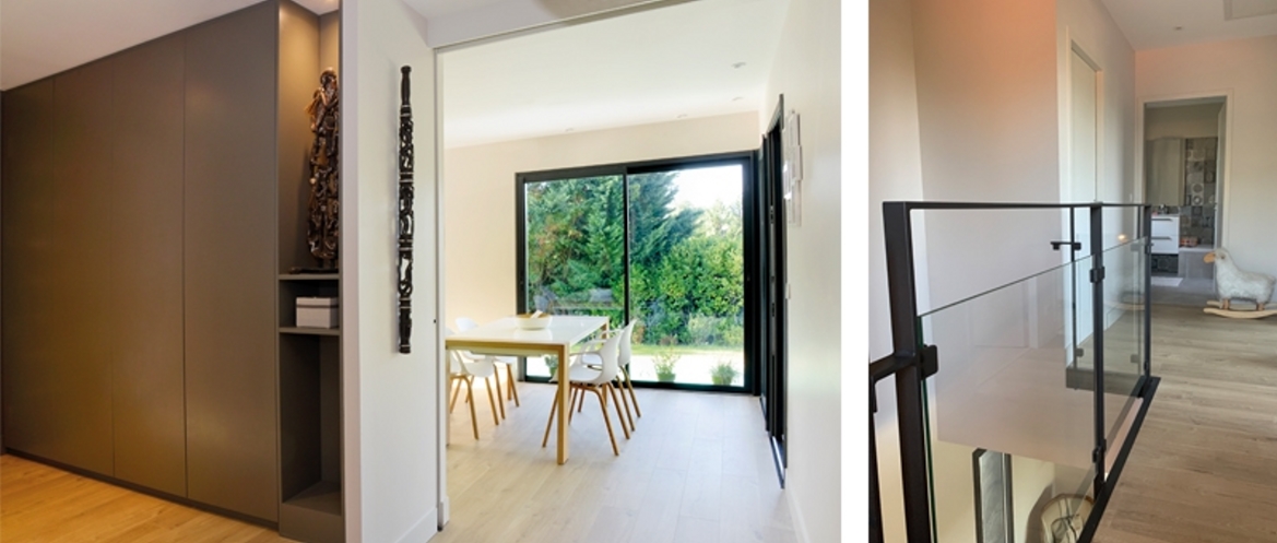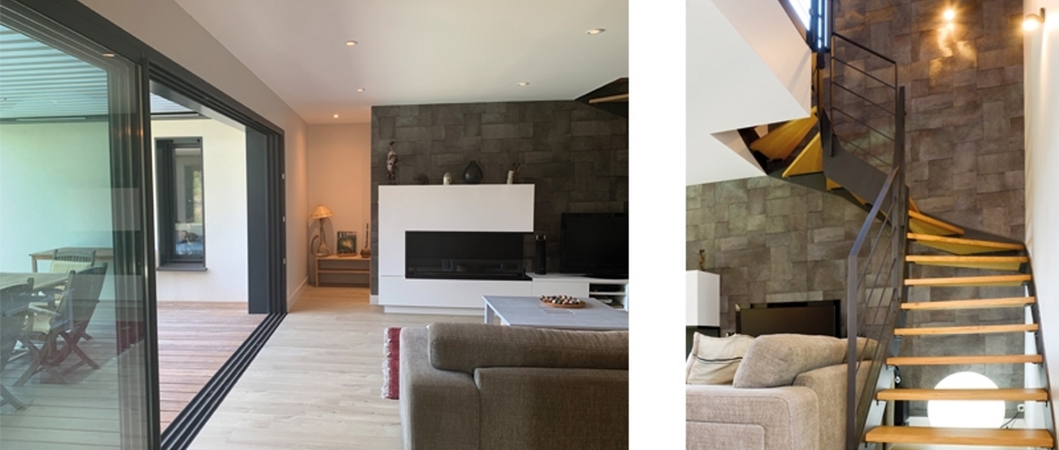 Façade en triptyque pour cette maison neuve de 170 m2 habitables orientée sud-ouest qui a été construite sur un terrain en pente de 16 %. Une contrainte qui a nécessité dès les premières esquisses un travail particulier sur les paliers à l’intérieur de la maison, la conception d’une terrasse extérieure sur deux niveaux pour épouser la forme du terrain et l’utilisation de béton banché pour les murs de la piscine. La pièce de vie dispose d’une baie vitrée monumentale de 4,50 m de long qui favorise un mode de vie dehors/dedans. Dans le séjour, un meuble dessiné sur mesure vient se poser sur un mur tapissé, il intègre l’espace télévision et une cheminée bio éthanol. L’escalier sur mesure en bois et métal patiné dessert l’étage et partout dans la maison, la circulation a été organisée de façon à séparer les espaces parents des espaces enfants. La terrasse bien que très ensoleillée, reste confortable même aux heures les plus chaudes. Elle a en effet été équipée d’une pergola bioclimatique orientable électriquement qui se referme automatiquement grâce à un détecteur de pluie.