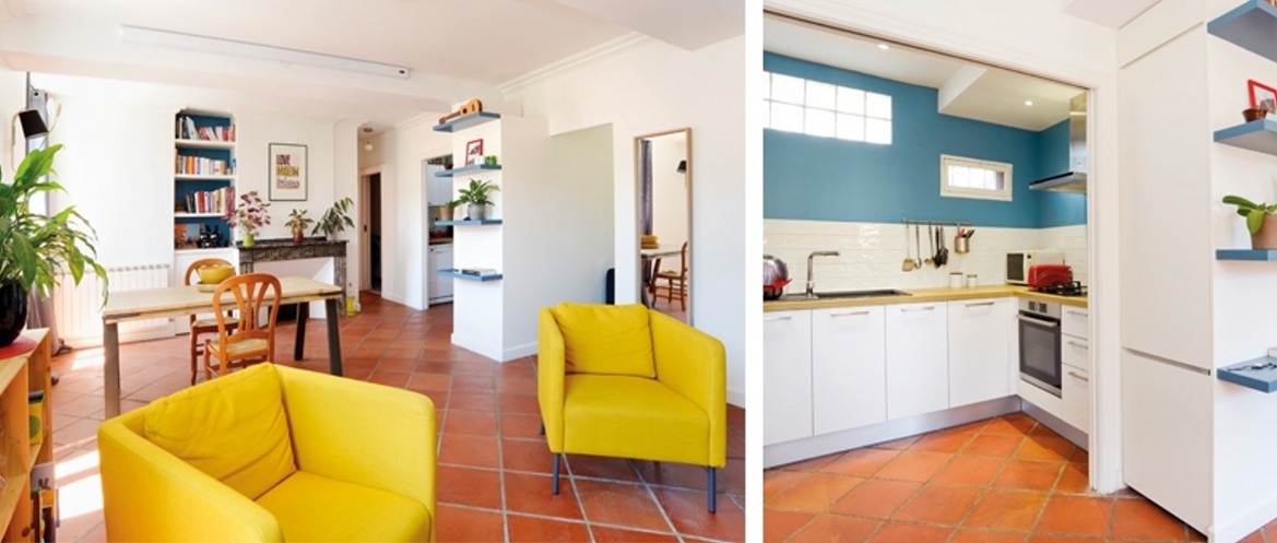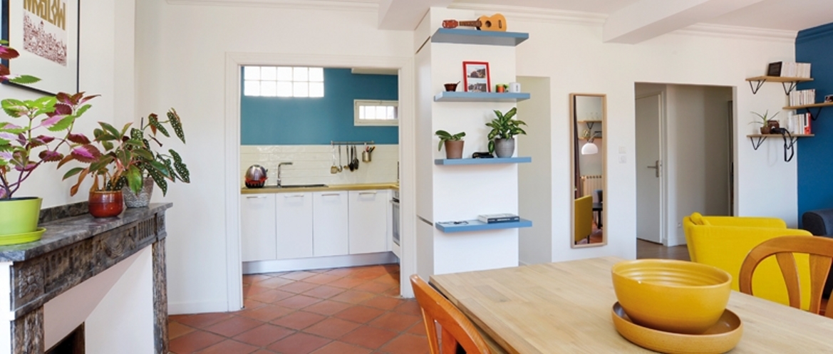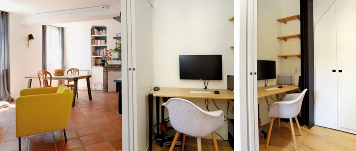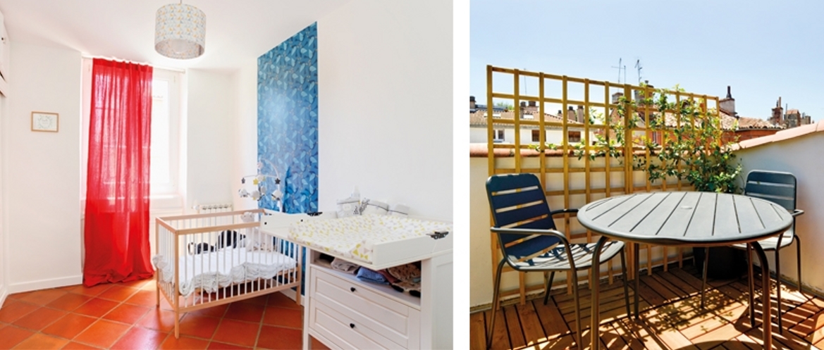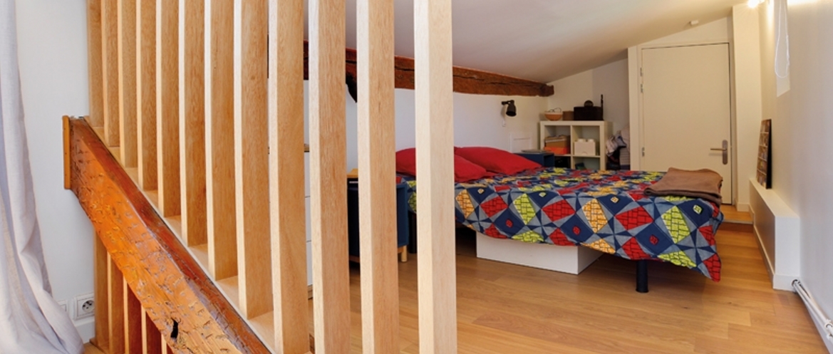 Au cœur des Carmes, ce couple épanoui nous a sollicité pour réaliser le potentiel de son duplex de 70 m2, en vue d’un heureux événement. Et par souci environnemental et logique, l’architecte préserve les tomettes, les rangements placés dans des niches et crée d’autres espaces, comme un placard d’entrée ou dans un dressing à l’étage. Enfin, elle redessine les portes, aligne les tracés et pour gagner en luminosité, redéfinit les boiseries. La cuisine a été complétement retravaillée, les façades et la crédence sont soulignées par un plan de travail en chêne. Le réfrigérateur à l’extérieur de l’espace cuisine a été intégré secrètement dans un meuble sur mesure. À l’étage, un nouveau parquet en chêne a été posé, des brise-vue ont été fixés à même la charpente pour préserver l’intimité de la chambre tout en permettant à la lumière de se diffuser depuis la terrasse. A l’issue d’une rénovation de 3 mois seulement, cet appartement niché sous les toits a vu son volume se libérer. Pour composer ce havre de lumière très fonctionnel, l’architecte s’est appuyée sur les contraintes de l’existant dont elle a valorisé chaque élément digne d’intérêt.