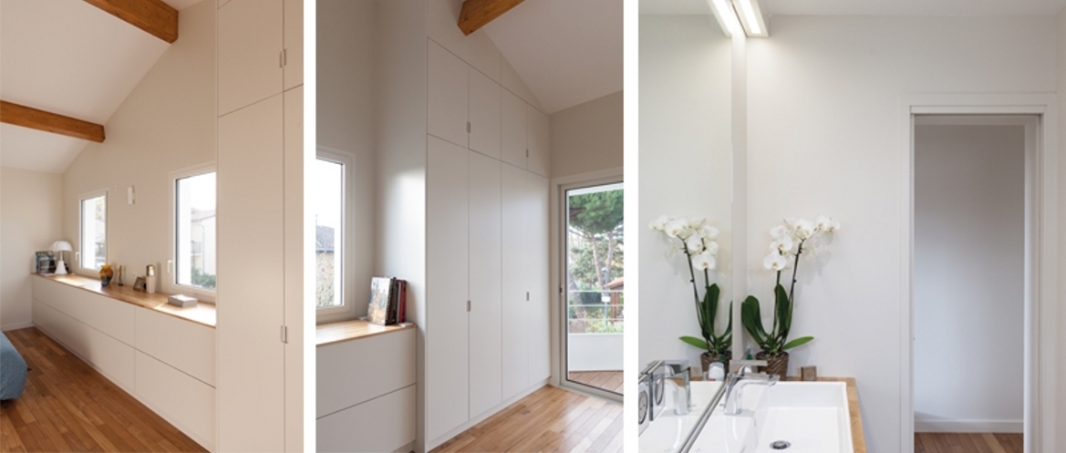 Pour créer une petite suite parentale comprenant une chambre, un dressing, une salle de bains et un espace extérieur, a été réalisée une surélévation partielle de la villa. Située à l’angle de deux voies, la parcelle existante est soumise à des règles d’urbanisme contraignant la surélévation à s’inscrire dans le volume existant et en deçà de ce dernier à l’angle de la construction. A l’ouest et dans le prolongement du volume créé, se loge un petit balcon, desservi par une large baie composée de 3 vantaux coulissants qui permettent une ouverture quasi totale de la façade. Un large volet à lames empilables et orientables protège cette extension à l’ouest du soleil et permet d’intimiser la pièce tout à loisir. Le traitement intérieur de la surélévation a privilégié les lignes simples. Le dressing a été conçu pour s’intégrer discrètement dans l’espace, la hauteur maximale a été conservée en suivant le rampant de la toiture créée, offrant une double hauteur sous faîtage et un haut volume à vivre voulu par la maîtrise d’ouvrage. Le sol intérieur comme extérieur reçoit un parquet en teck massif. Le balcon est en acier thermolaqué blanc. Les lumières indirectes « Up and Down » valorisent la hauteur du volume conçu.