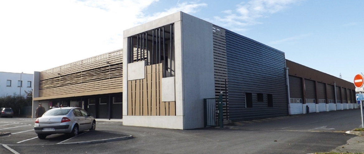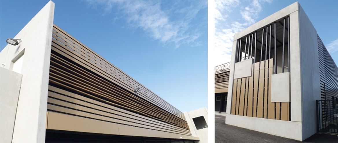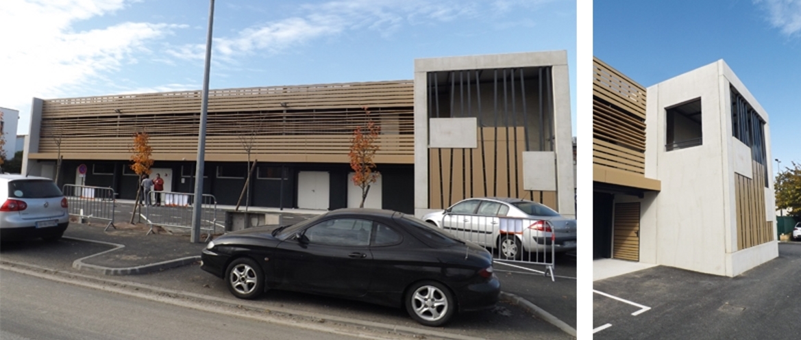À l’origine un auvent métallique sommaire formant la façade pignon d’un bâtiment communal sur la rue de Partanaïs. Le projet consiste d’une part en l’aménagement des locaux du Secours Populaire en rez-de-chaussée et d’autre part en la création d’un plateau prêt à être aménagé à l’étage. Nous avons proposé de positionner les circulations horizontales et verticales à l’extérieur afin de libérer un maximum de surfaces aménageables. Les locaux s’ouvrent au rez-de-chaussée sur un cheminement protégé par un large auvent s’étirant sur la longueur de la façade. L’étage est desservi par une coursive. Cette coursive est elle aussi protégée par une couverture. Moins large que celle du rez-de-chaussée elle est plus exposée. Nous avons complété cette protection avec une façade ajourée en lames de FunderMax qui sert aussi de garde-corps. Une large bande de vision participe à cette protection. Elle est réalisée par des lames en tasseaux de bois thermotraités et posés sur chan. La tension horizontale de cet ensemble est mise en valeur par les lignes brisées de ces lames. Les cages d’escaliers positionnées aux extrémités permettent de « caler » cette façade. Elles sont réalisées par un assemblage de prémurs bétons verticaux. Ici la verticalité s’exprime aussi à travers des lignes obliques. Les façades métalliques des locaux sont en retrait jouant leur fonction d’enveloppe en toute simplicité et efficacité.